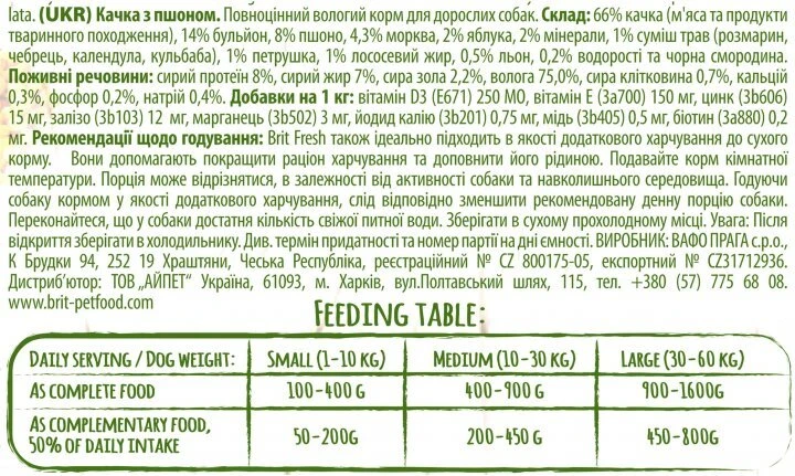 Склад: 66% качка, 14% бульйон, 8% пшоно, 4.3% морква, 2% яблука, 2% мінерали, 1% суміш трав (розмарин, чебрець, календула, кульбаба), 1% лососеве масло, 1% петрушка, 0.5% насіння льону, 0.2% водорості та чорна смородина.