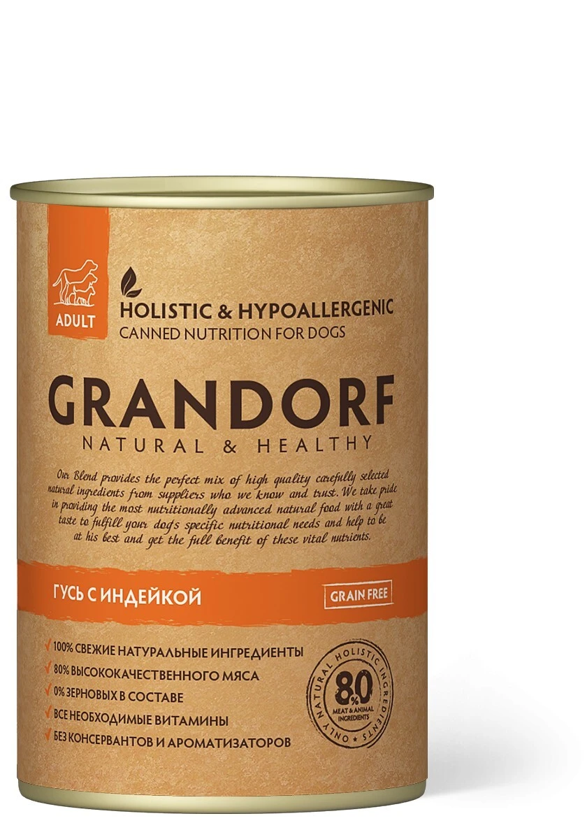 Природне беззернове гіпоалергенне харчування з м'яса гусака та індички. Ідеально підходить для собак з чутливим травленням або схильних до алергії.