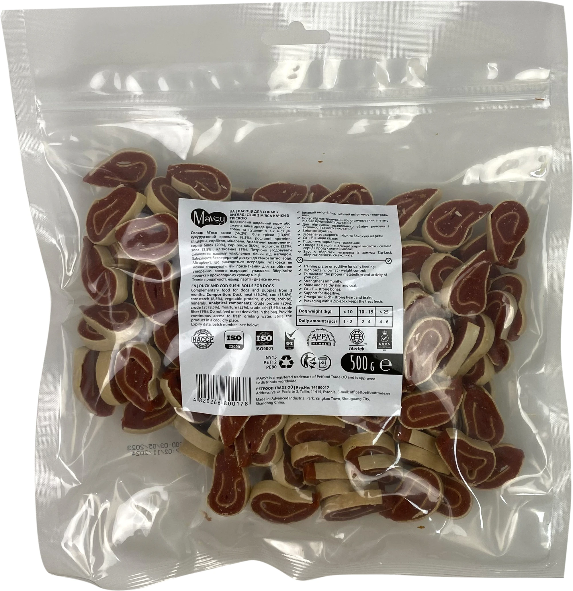 Склад: М'ясо качки (56,2%), філе тріски (13,6%), кукурудзяний крохмаль (8,5%), рослинні протеїни, гліцерин, сорбіт, мінерали.