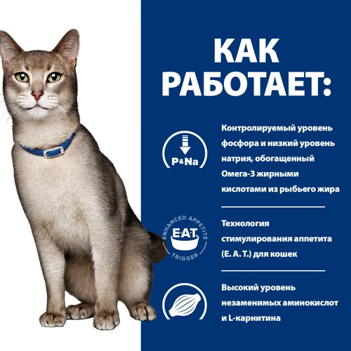 Клінічно доведено, що сухий корм для котів Hill's Prescription Diet k/d з запатентованою технологією підвищення апетиту Enhanced Appetite Trigger (E.A.T.) посилює апетит у котів з хворобою нирок, які потребують підвищеного споживання калорій.