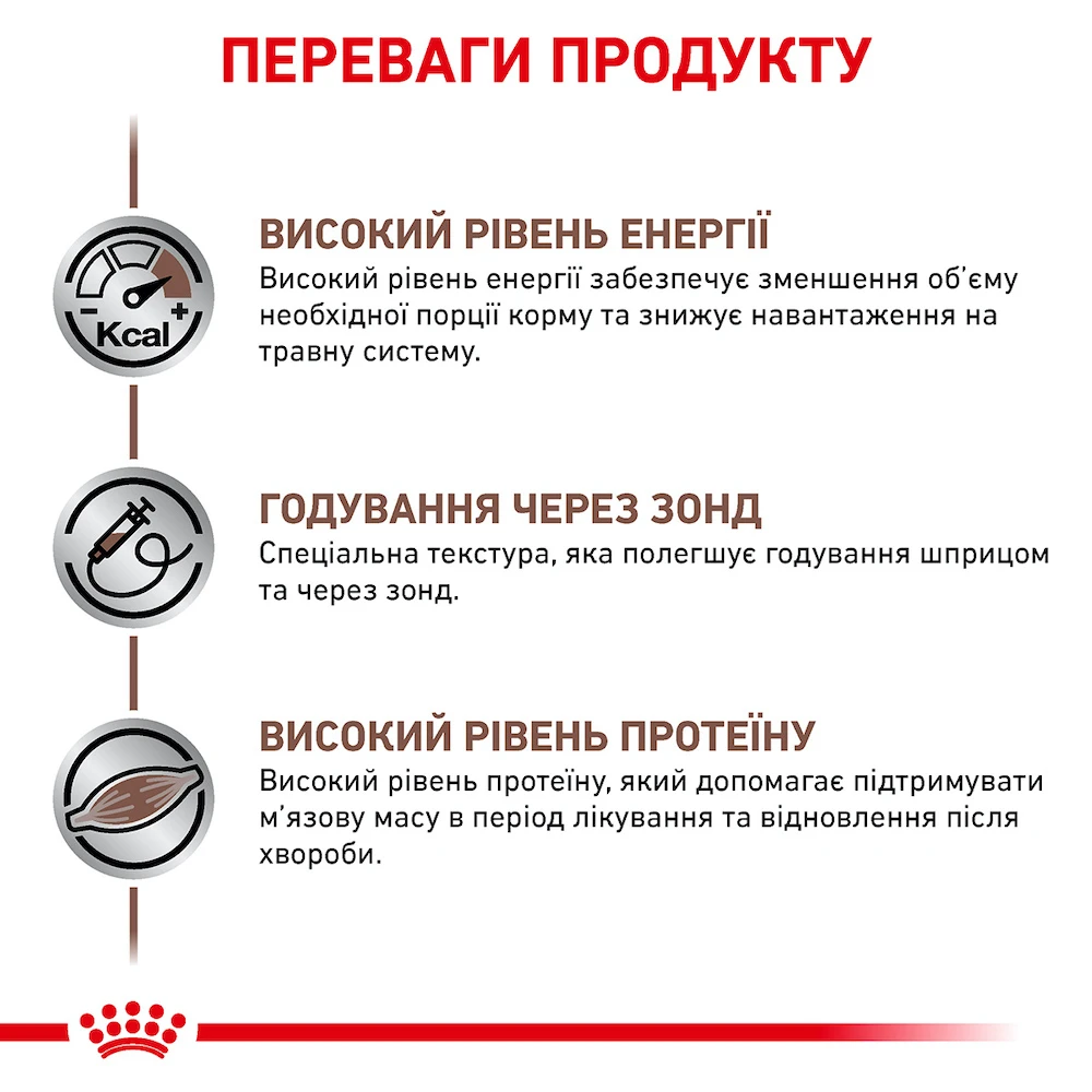 Після операції або важкого захворювання вихованцеві потрібне лікувальне харчування з оптимальним складом і хорошими смаковими якостями. Спеціально для таких випадків розроблено Роял Канін Рекавері для собак - однорідний мус з адаптованою формулою, який підходить для звичайної годівлі та введення через зонд (розмір трубки понад 10Fr). Коли стан здоров'я відновлюється, тварину переводять на стандартні раціони з урахуванням породи та віку.