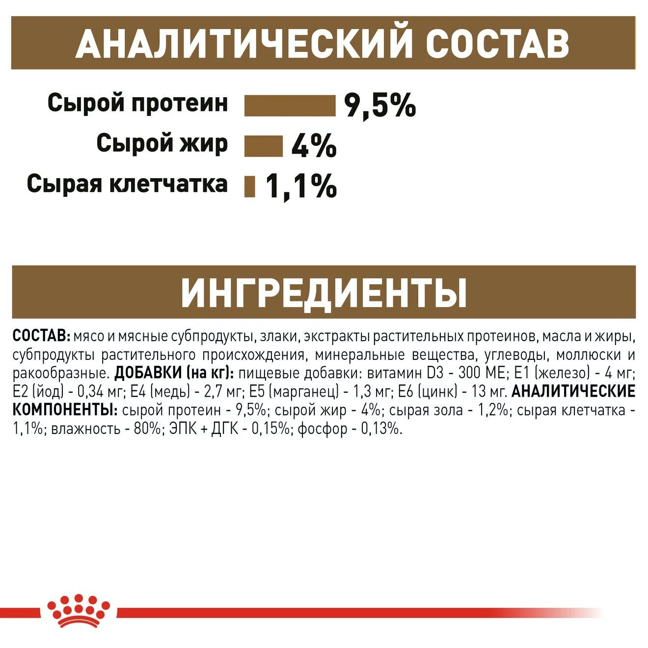 сирий білок - 9,5%; сирий жир - 4%; сирий попіл - 1,2%; сире волокно - 1,1%; вологість - 80%; ЕПК/ДГК - 0,15%; фосфор - 0,13%.