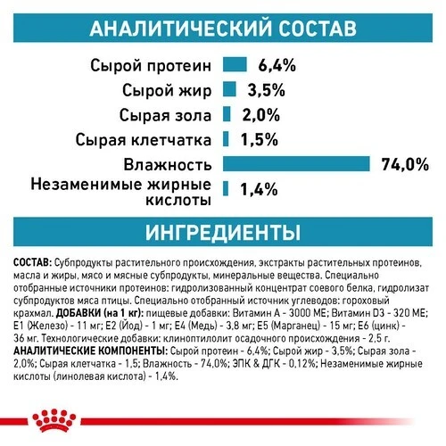 Субпродукты растительного происхождения (крахмал гороха), экстракты растительных протеинов (гидролизованные протеины сои), масла и жиры, минералы, мясо и мясные субпродукты (гидролизованная печень домашней птицы), углеводы, минеральные вещества, добавки: витамин А 5000 МЕ, витамин D3 340 МЕ, Е1 (железо) 25 мг, Е2 (йод) 2 мг, Е4 (медь) 6 мг, Е5 (марганец) 32 мг, Е6 (цинк) 120 мг. Содержит жирные кислоты Омега 3 - 0,3% и Омега 6 - 1,7%.