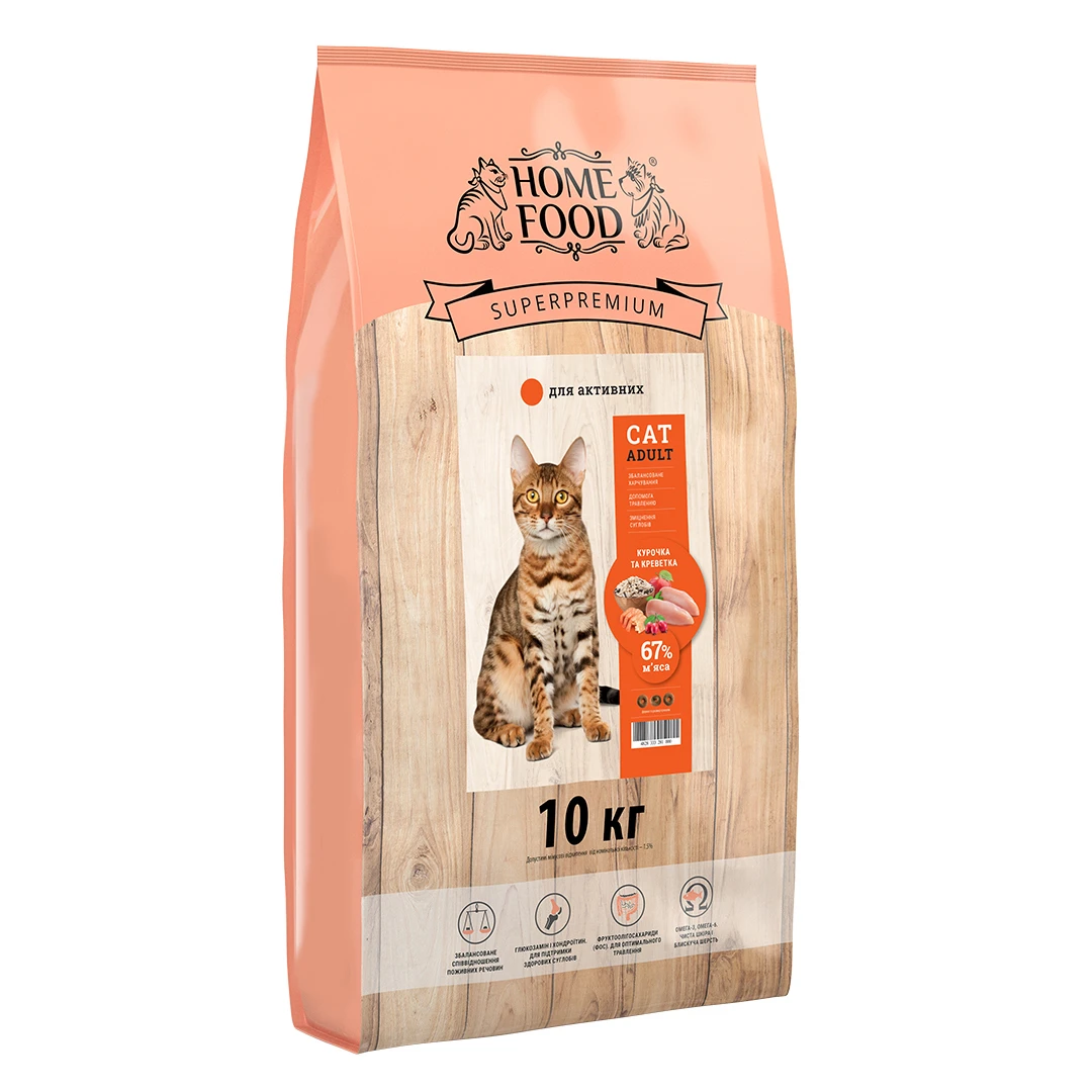 Супер-преміальний корм для дорослих активних котів виготовлений на основі свіжого курячого м'яса та цільної свіжої креветки. Курятина забезпечує організм котів корисними тваринними білками і має високий рівень засвоюваності. Є дієтичним продуктом, що містить низький рівень жирів і холестерину, нормалізує вагу та підтримує здоровий стан серцево-судинної системи вихованця. Крім того, курка багата цинком, що сприяє росту та відновленню м'язів і загоєнню ран, допомагає імунній системі боротися з бактеріями та вірусами. Містить незамінну амінокислоту лізин, яка сприяє засвоєнню кальцію. У курячій печінці міститься велика кількість таурину, який підтримує здоров'я органів зору котів, запобігає атрофії сітківки ока та сліпоті.