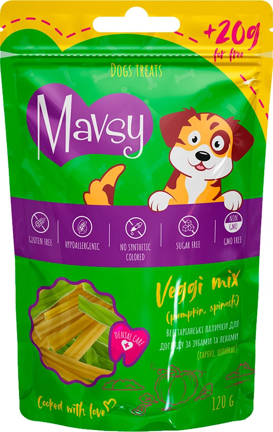 Лакомство для собак в виде палочек из изысканного пюре курицы тыквы и шпината.