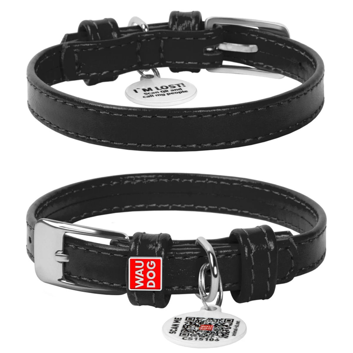Ошейник для собак кожаный WAUDOG Glamour с QR паспортом, без украшений, Ш 12 мм, Дл 21-29 см, черный