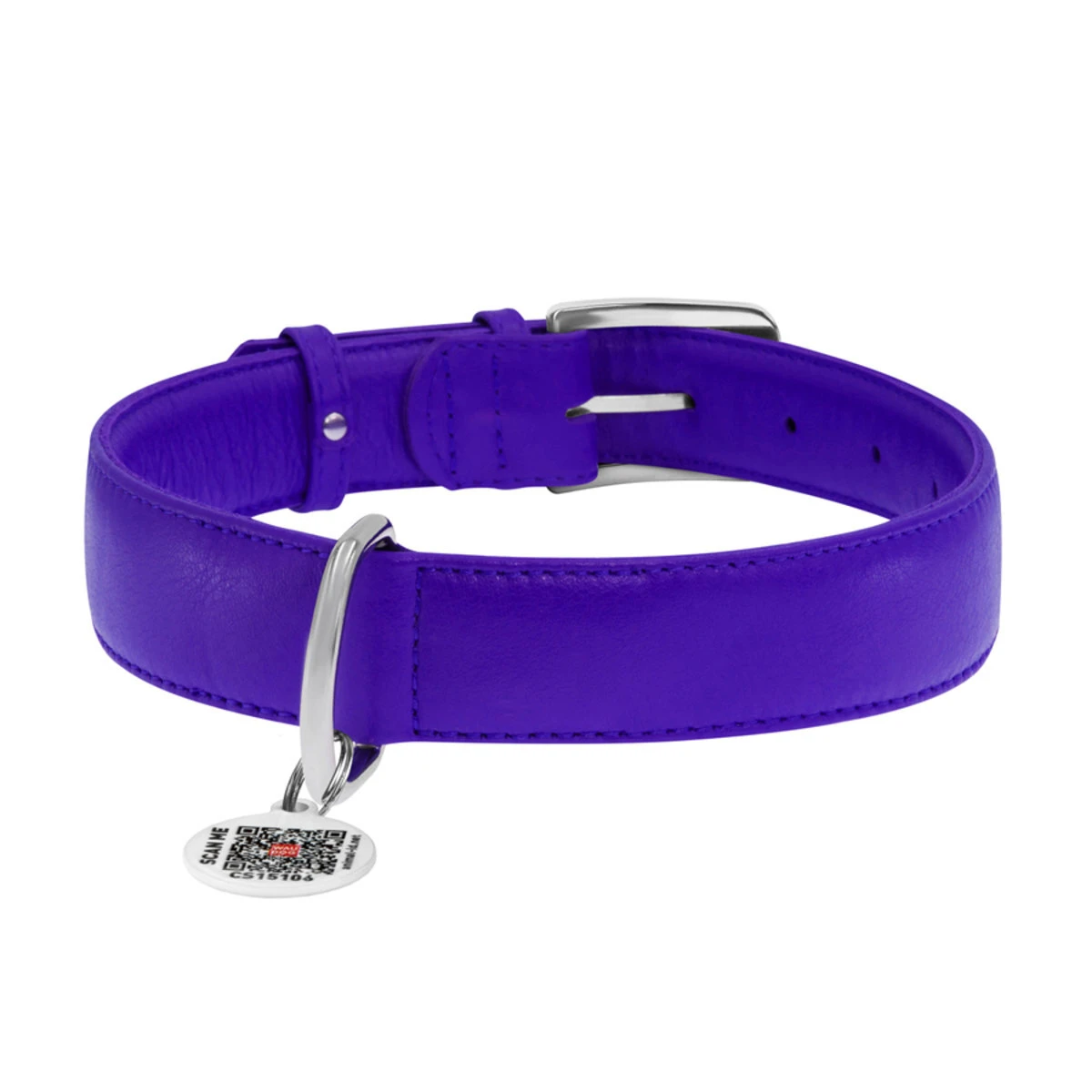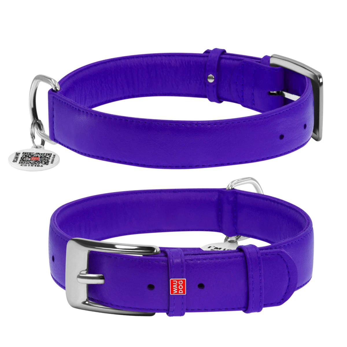 Ошейник для собак кожаный WAUDOG Glamour с QR паспортом, без украшений, Ш 35 мм, Дл 46-60 см, фиолетовый