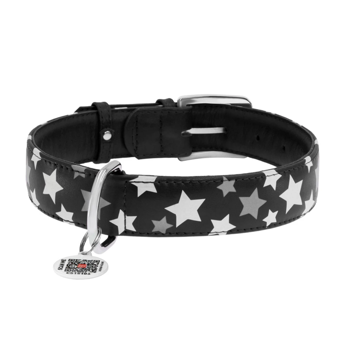 Ошейник для собак кожаный WAUDOG Glamour с QR паспортом, узор "Звёздочка", светящийся/светоотражающий, Ш 35 мм, Дл 46-60 см, черный