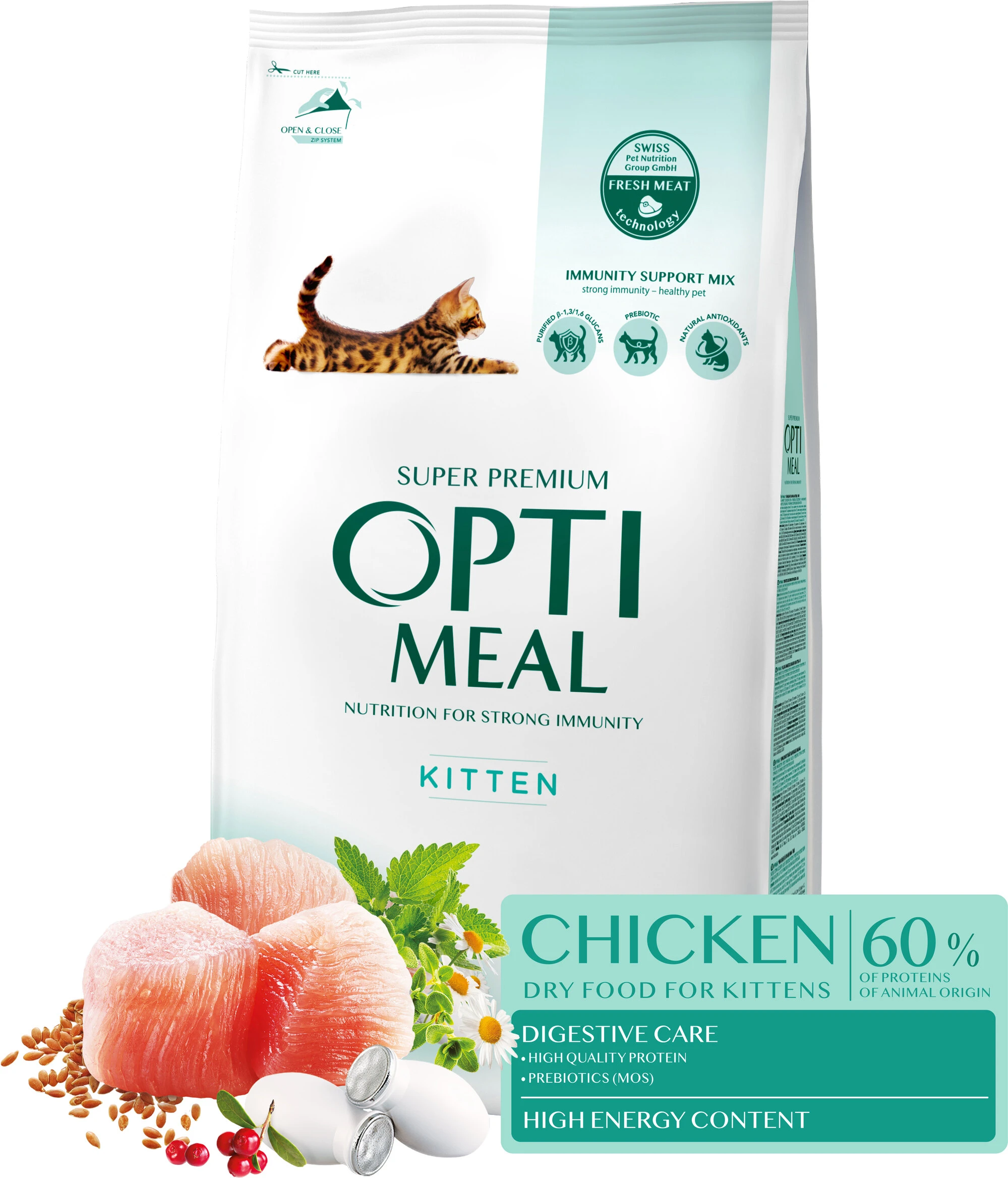 Полнорационный сухой корм для котят Optimeal – курица 1.5 кг. Укрепляет иммунитет. Легкоусвояемый белок и пребиотики способствуют пищеварению. Оптимальное соотношение Ca, P и витамина D3 обеспечивает здоровый рост.