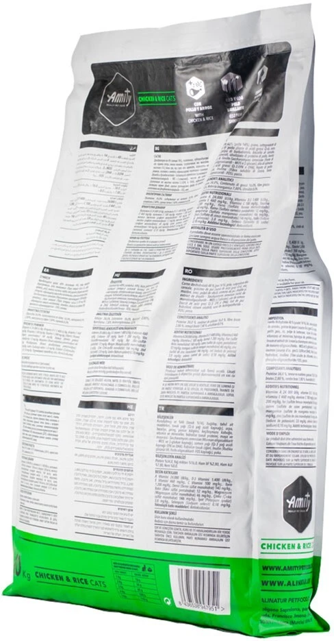 Корм для котов Amity позаботиться о питании любимого питомца. Рецепт с курицей и рисом придётся по вкусу любому питомцу. Вкусные гранулки корма будут с аппетитом схруманы, но мы рекомендуем придерживаться суточных норм кормления. Корм обогащен витамины и минералами в количестве необходимом для повседневного питания. Несмотря на основу — мясо курицы, в корме есть жир лосося, как незаменимый источник жирных кислот. Заботиться о питании — легко, вместе с рецептами корма Amity.