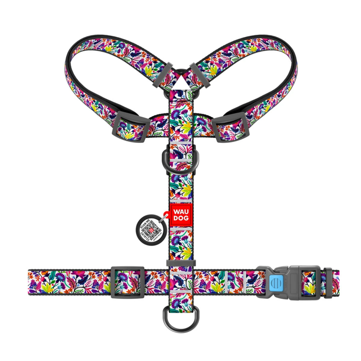 Шлея для собак анатомическая H-образная WAUDOG Nylon с QR-паспортом, рисунок "Волшебные цветы", пластиковый фастекс, S, Ш 15 мм, A 30-40, B 30-50