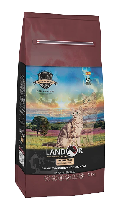 Повнораціоннй сухий корм для котів з функцією контролю ваги та утворення грудок шерсті. Багато власників домашніх вихованців стикаються з проблемою утворення грудок шерсті у своїх вихованців. Це відбувається через те, що в організмі вашого улюбленця бракує таких необхідних речовин, як залізо, цинк і вітамін В. Корм LANDOR розроблений спеціально для таких вихованців. На основі м'яса ягняти і батату, з високим вмістом речовин, які необхідні для підтримки шлунково-кишкового тракту. У складі корму немає зернових продуктів, і в достатній кількості містяться всі необхідні для організму вихованця білки, вітаміни і мікроелементи, які повернуть шерсті натуральну гладкість і еластичність. Також забезпечується функція контролю ваги тварини.