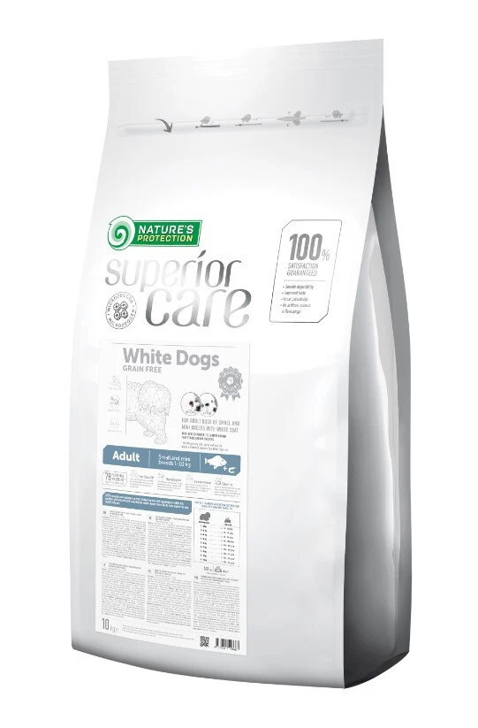 Nature's Protection Superior Care White Dogs - беззерновой сухой корм супер-премиум класса для взрослых собак мелких и очень мелких пород (1-10 кг) с белой и светлой шерсти (размер гранулы 6-8мм).