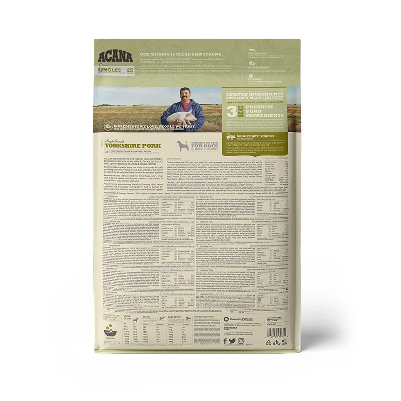 ACANA Yorkshire Pork содержит непревзойденное разнообразие ингредиентов, выращенных и выловленных в Канаде, людьми которых мы знаем и которым мы доверяем. Ингредиенты подлежат определению «пригодные для употребления в пищу человеком», и доставляются на наши отмеченные наградами кухни NorthStar свежими каждый день!