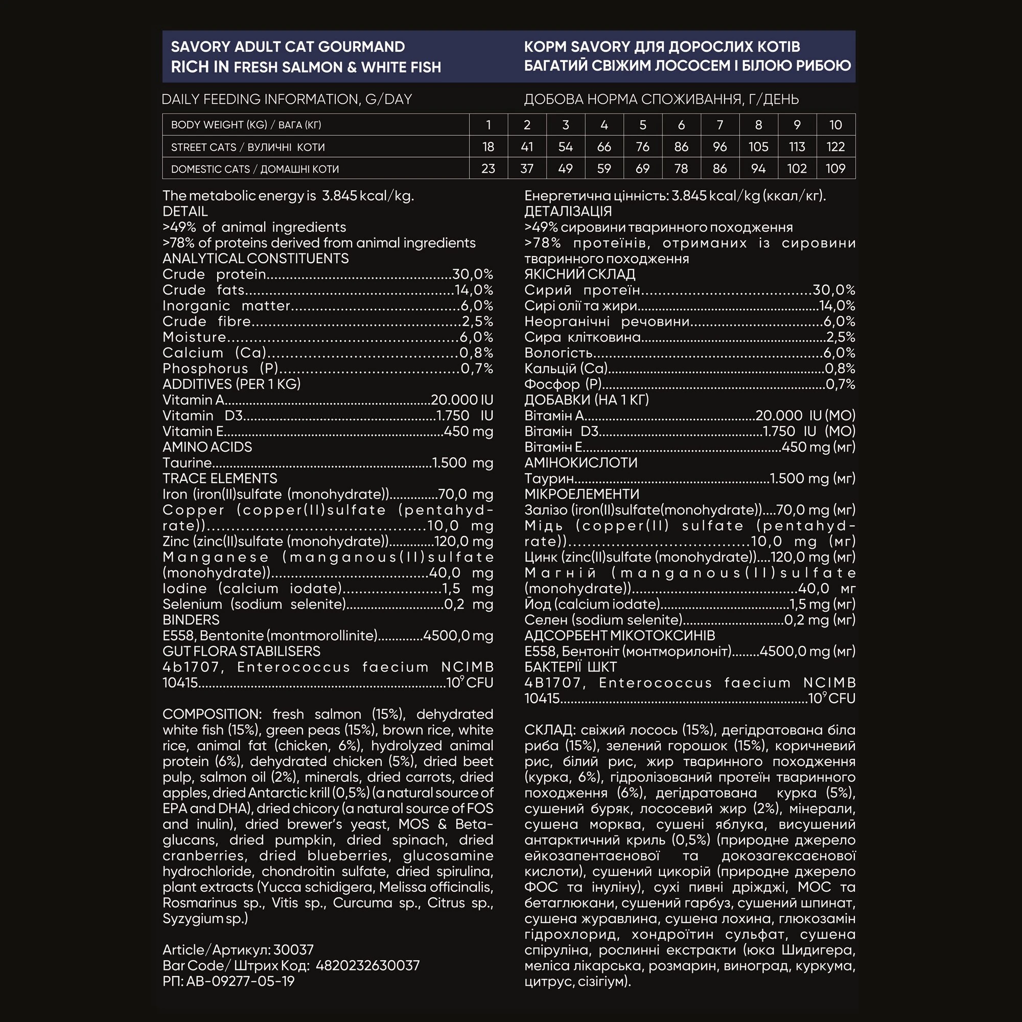 Состав: свежий лосось (15%), дегидратированная белая рыба (15%), зеленый горошек (15%), коричневый рис, белый рис, жир животного происхождения (курица, 6%), гидролизованный протеин животного происхождения (6%), дегидратированная курица (5%), сушеная свекла, лососевый жир (2%), минералы, сушеная морковь, сушеные яблоки, высушенный антарктический криль (0.5%) (натуральный источник эйкозапентаеновой и докозагексаеновой кислоты), сушеный цикорий (натуральный источник ФОС и инулина), сухие пивные дрожжи, МОС и бетаглюкан, сушеная тыква, сушеный шпинат, сушеная клюква, сушеная голубика, глюкозамин гидрохлорид, хондроитин сульфат, сушеная спирулина, растительные экстракты (юкка Шидигера, мелисса лекарственная, розмарин, виноград, куркума, цитрус, сизигиум).