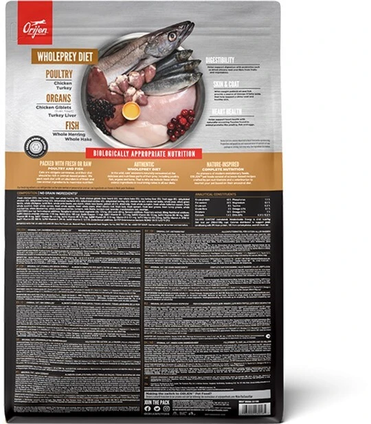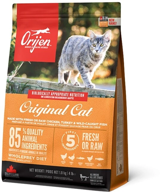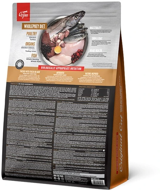 Рацион ORIJEN Original Cat изготовлен из свежих или сырых мясных ингредиентов из цыплят и индейки, выращенных на свободном выгуле и рыбы, выловленной в дикой природе.