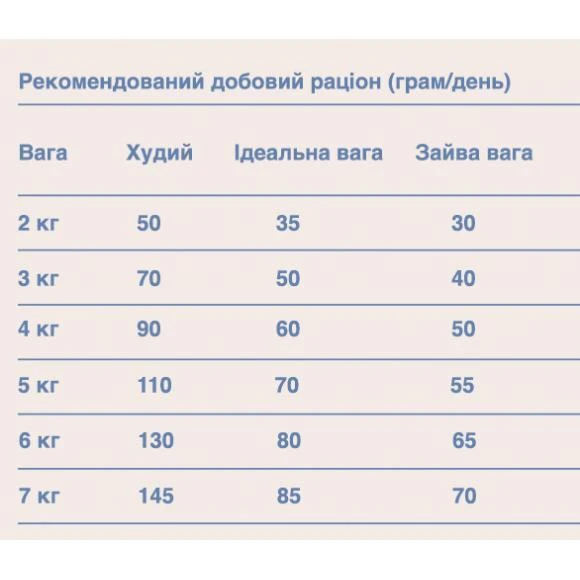 - Соблюдайте рекомендуемые нормы кормления, указанные в таблице, однако учитывайте индивидуальные особенности животного. Рацион должен отвечать энергетическим потребностям кошки