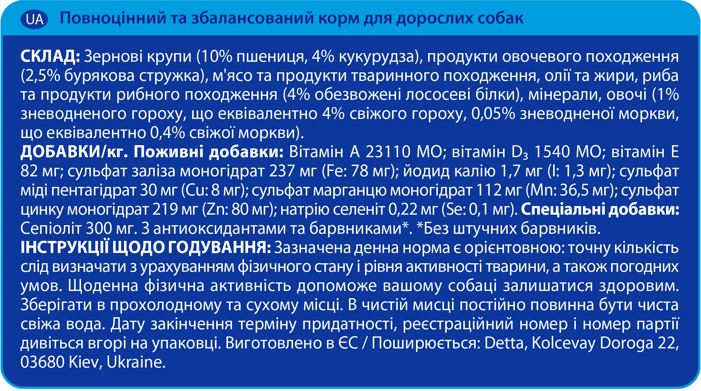 Состав: Зерновые крупы (10% пшеница, 4% кукуруза), продукты овощного происхождения (2.5% свекольная стружка), мясо и продукты животного происхождения, масла и жиры, рыба и продукты рыбного происхождения (4% обезвоженные лососевые белки), минералы , овощи (1% обезвоженного гороха, что эквивалентно 4% свежего гороха, 0.05% обезвоженной моркови, что эквивалентно 0.4% свежей моркови).
