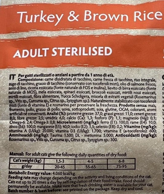 Состав: Высушенное мясо индейки, свежее мясо индейки, цельнозерновой коричневый рис, соус из индейки, жир индейки (консервированный со смешанными токоферолами), свежее масло лосося, семена льна, сушеный цикорий (естественный источник FOS и инулина), сушеные натуральные источник МОС), сушеное яблоко, сушеный шпинат, сушеная брокколи, сушеная клюква, сушеная черника, клетчатка, юкка Шидигера, DL-метионин, смесь растительных экстрактов (Розмарина, Винограда, Куркумы, Цитрусовых и Сигизиума). Сохранены смешанными токоферолами (источник витамина Е) и розмарином для сохранения свежести.