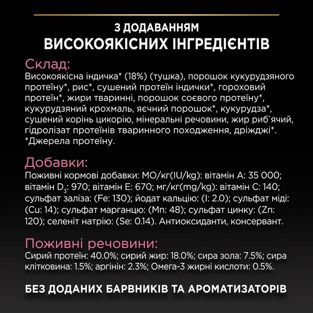 Состав: высококачественная индейка* (18%) (тушка), порошок кукурузного протеина*, рис*, сушеный протеин индейки*, гороховый протеин*, жиры животные, порошок соевого протеина*, кукурузный крахмал, яичный порошок*, кукуруза цикория, минеральные вещества, жир рыбий, гидролизат протеинов животного происхождения, дрожжи*.