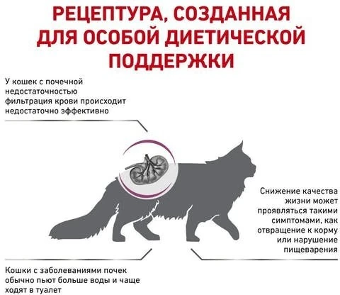 Пониженное содержание фосфора и умеренное количество белка для поддержания функции почек. Помогает повысить качество жизни кошки.