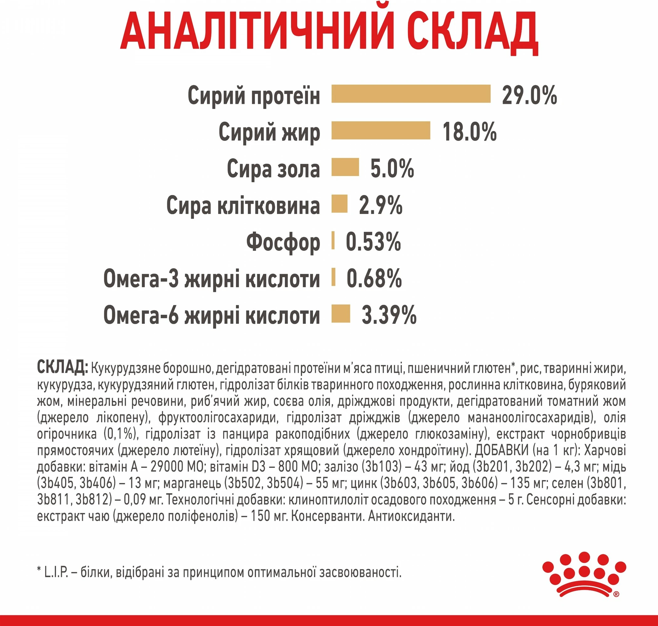 Кукурузная мука, дегидратированные протеины мяса птицы, пшеничный глютен, рис, животные жиры, изолят протеинов растительного происхождения*, кукуруза, гидролизат белков животного происхождения, кукурузный глютен, растительная клетчатка, свекольный жом, рыбий жир, минеральные вещества, соевое масло, дрожжи и их частицы, фруктоолигосахариды, гидролизат дрожжей (источник маннанолигосахаридов), масло огуречника (0.1%), гидролизат из панциря ракообразных (источник глюкозамина), экстракт бархатцев прямостоячих (источник лютеина), гидролизат из хряща (источник хондроитина).