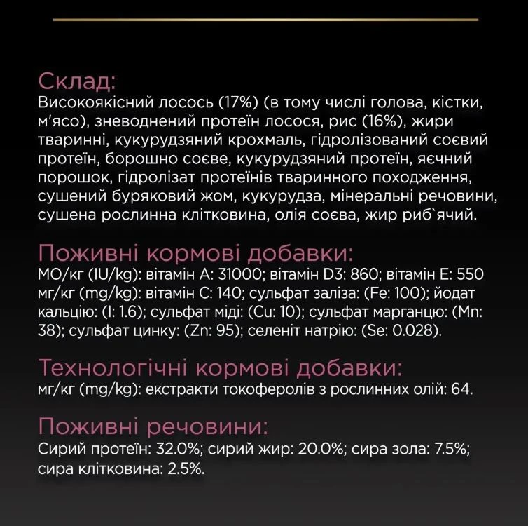 Состав: лосось (17%) (в том числе голова, кости, мясо), обезвоженный протеин лосося*, рис* (16%) , жиры животные, кукурузный крахмал, кукурузный протеин*, гидролизат протеинов животного происхождения, сушеный свекловичный жом *, кукуруза*, минеральные вещества, сушеная растительная клетчатка, масло соевое, жир рыбий. (*Источники протеина).