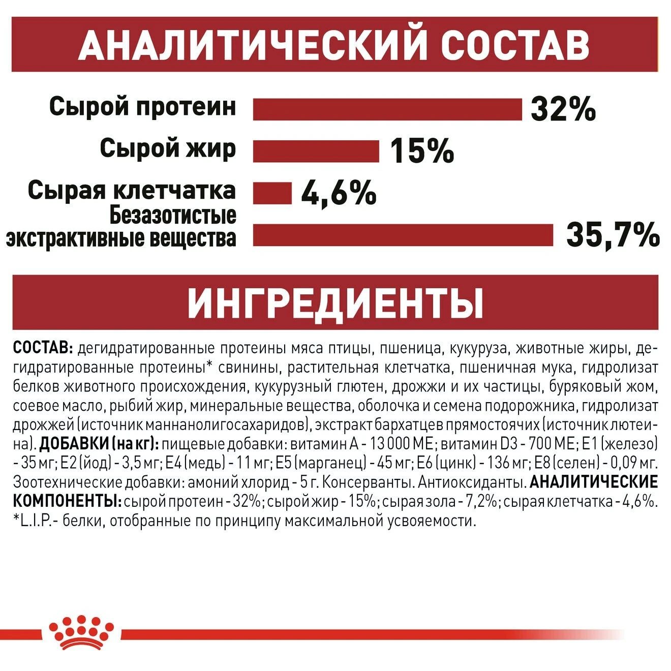 сырой протеин - 32%; сырой жир - 15%; сырая зола - 7,2%; сырая клетчатка - 4,6%; кальций - 1,16%; фосфор - 1,1%; омега-6 - 3,46%; омега-3 - 0,63%, в т. ч. ЭПК/ДГК - 0,2%.