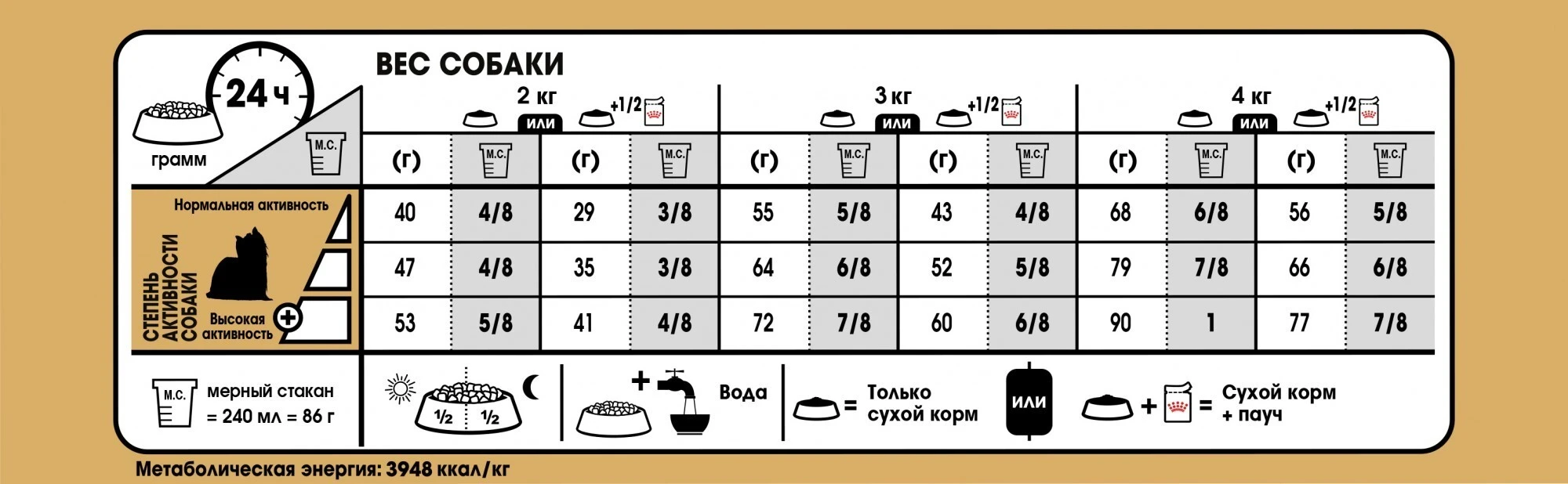 РЕКОМЕНДОВАНА ЩОДЕНА Дозування (у грамах): Вага дорослої собакіНормальна активністьПідвищена активність 2 кг 41 г 4/8 ст 47 г 4/8 ст 3 кг 55 г 5/8 ст 64 г 6/8 ст 4 кг 68 г 6 / 8 ст була свіжа вода! Інгредієнти рис, дегідратоване м'ясо птиці, кукурудзяна мука, тваринні жири, ізолят рослинних білків, кукурудзяна клейковина, кукурудза, гідролізовані тваринні білки, рослинна клітковина, буряковий жом, мінеральні речовини, рослинні масла фруктоолігосахариди, поліфосфат натрію, таурин, екстракт дріжджів (джерело манноолігосахаридів), DL-метіонін, яєчний порошок, гідролізовані ракоподібні (джерело глюкозаміну), L-тирозин, екстракти зеленого L-карнітин, гідролізовані хрящі (джерело хондроїтину), екстракт чорнобривців (джерело лютеїну).