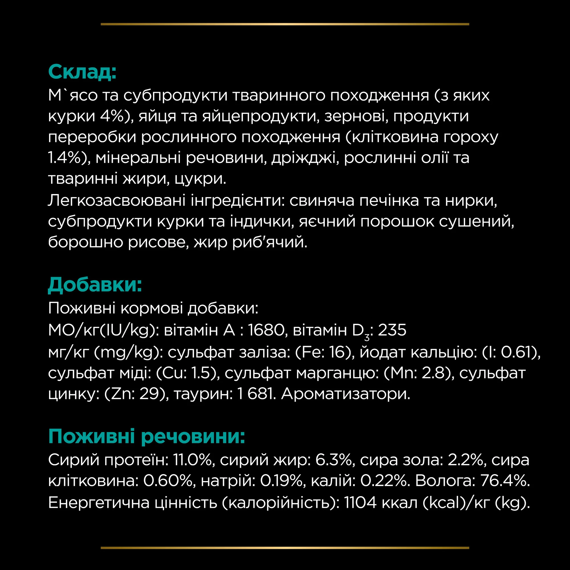 Состав: Мясо и субпродукты животного происхождения (из которых курицы 4%), яйца и продукты их переработки, зерновые, продукты переработки растительного сырья (клетчатка гороха 1.4%), минеральные вещества, дрожжи, животный жир, аминокислоты (глицин), загуститель (камедь ксантановая), витамины, сахара. Легкоусвояемые ингредиенты: курица, индейка, печень, почки, яичный порошок, рисовая мука, рыбий жир.