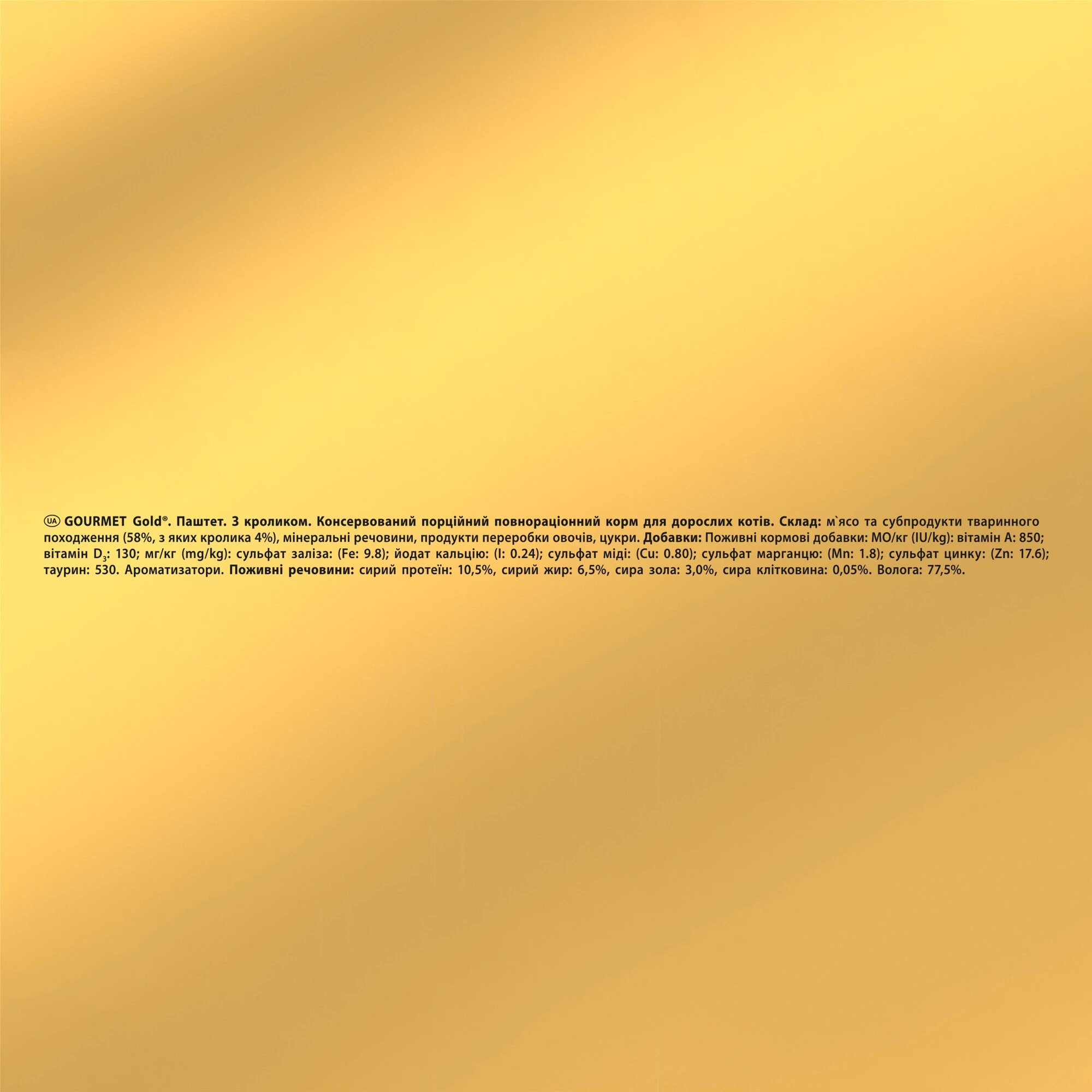 Ваш кот ценит разнообразие в блюдах, а Вы всегда в поиске рецептур, удовлетворяющих его изысканный вкус. Именно поэтому Gourmet Gold создал Паштет – рецепт, способный привести в восторг даже настоящего гурмана. Нежный паштет с кроликом приготовлен с заботой для того, чтобы Ваш любимец получил настоящее удовольствие. Паштет от Gourmet Gold – удовольствие воплощено в нежности!