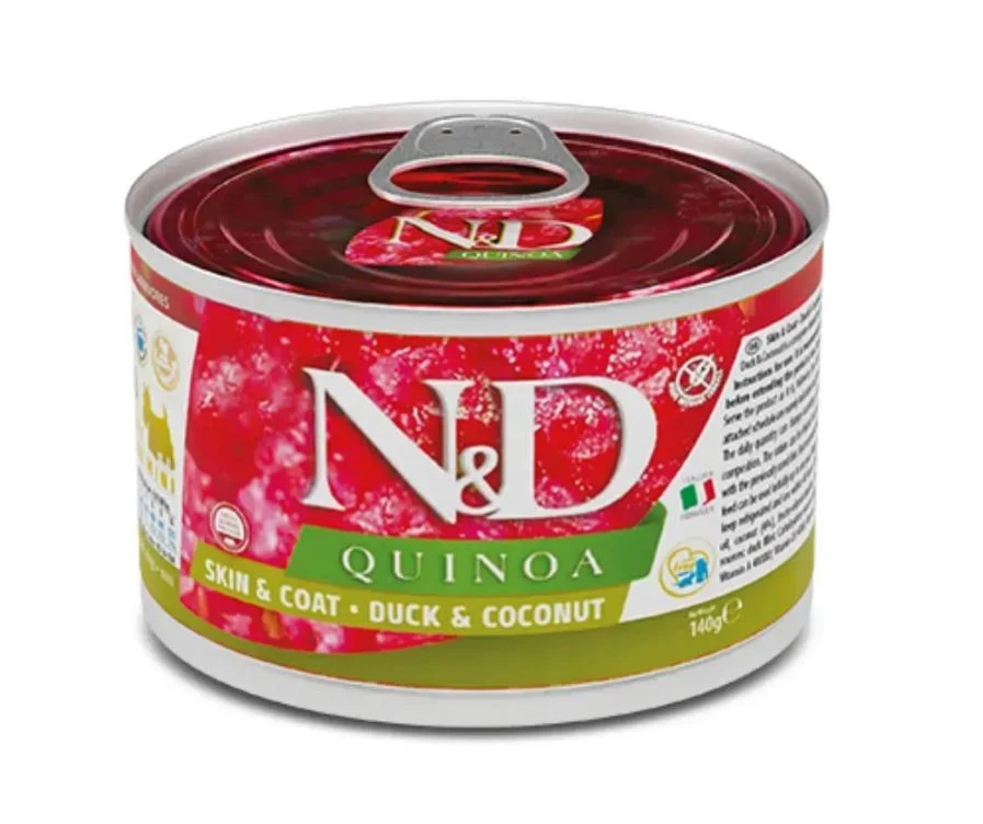 Farmina ND Quinoa Skin & Coat Duck Coconut — это полнорационный диетический корм, специально разработанный для взрослых собак с чувствительной кожей и склонностью к аллергиям. Благодаря тщательно подобранному составу он помогает снизить непереносимость ингредиентов и питательных веществ, обеспечивая питомцу полноценное и сбалансированное питание.