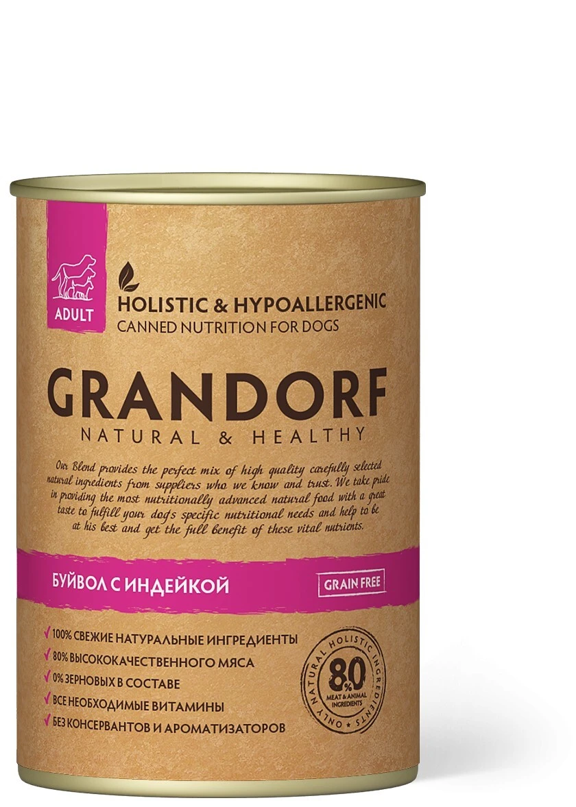 Натуральное беззерновое гипоаллергенное питание из мяса буйвола и индейки. Идеально для собак с чувствительным пищеварением или склонных к аллергии.