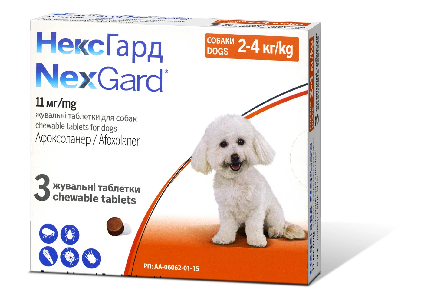 NexGard (НексГард) новый препарат для борьбы с эктопаразитами собак, дозировка S — для собак весом от 2 до 4 кг.