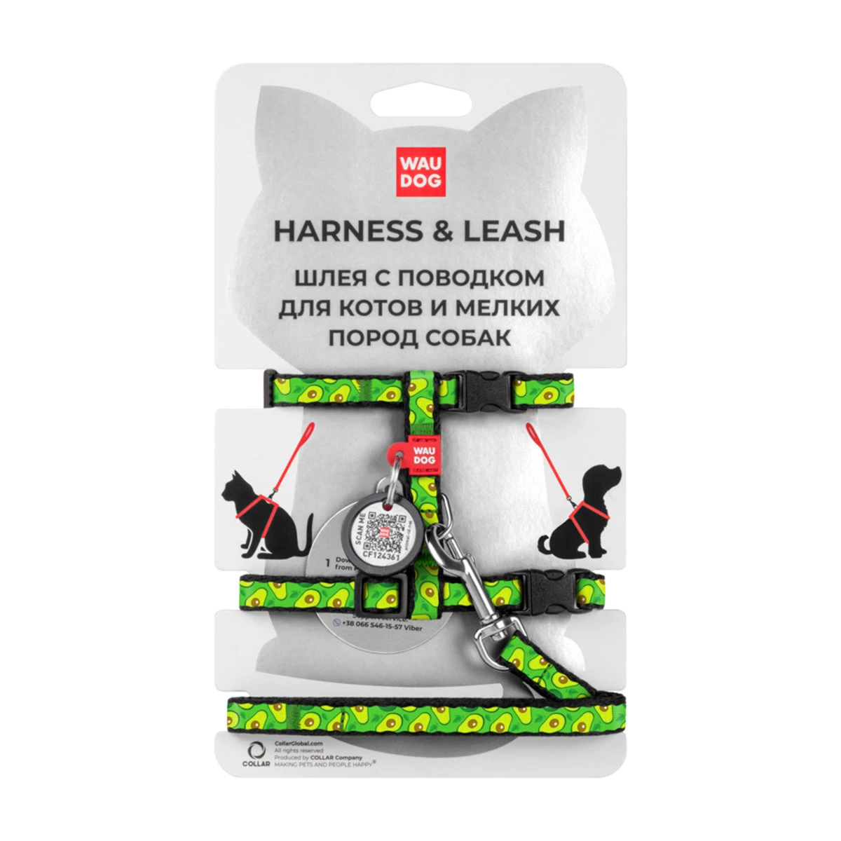 Шлея з повідцем для котів WAUDOG Nylon з QR паспортом, малюнок "Авокадо", пластиковий фастекс, Ш 10 мм, В 25-40 см, С 20-30 см