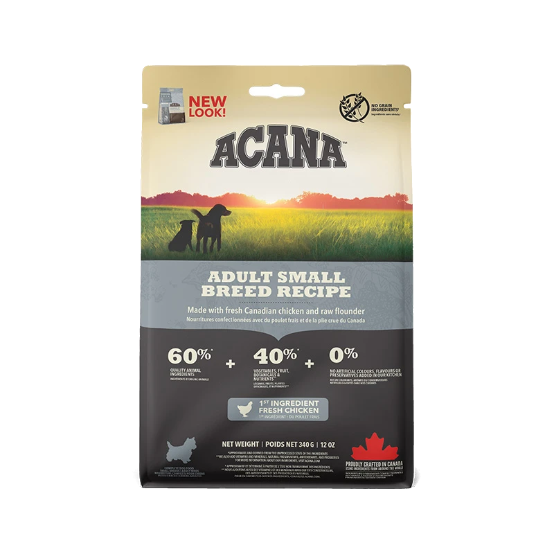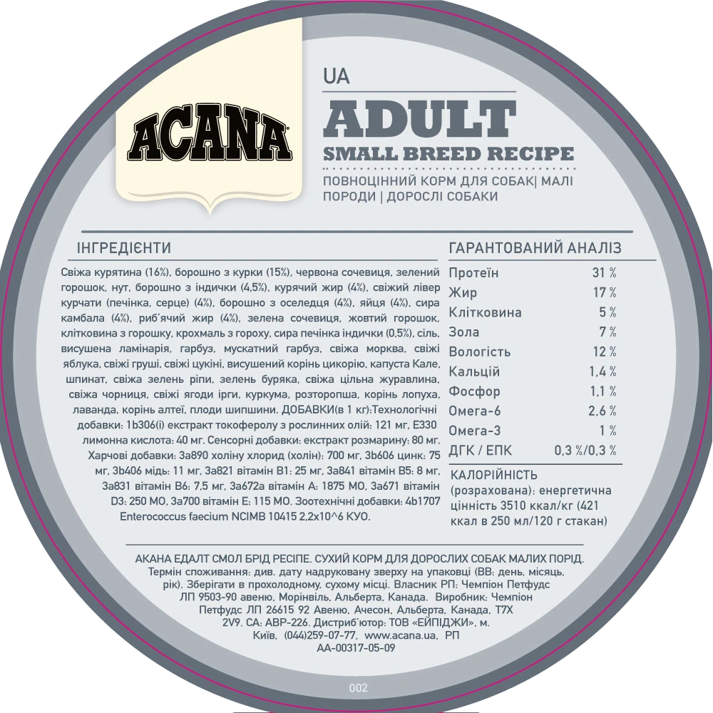 Коли йдеться про корм ACANA, кожен інгредієнт має значення. Тому рецептура корму ACANA Adult Small Breed Recipe створюється з турботою, щоб забезпечити всі потреби дорослих собак малих порід у харчуванні. Рецептура АКАНА Едалт Смол Брид Ресипе на 60% переповнена якісними м'ясними інгредієнтами, такими як м'ясо канадських курчат і сирий камбала, і на 40% збалансована фруктами, овочами та травами.