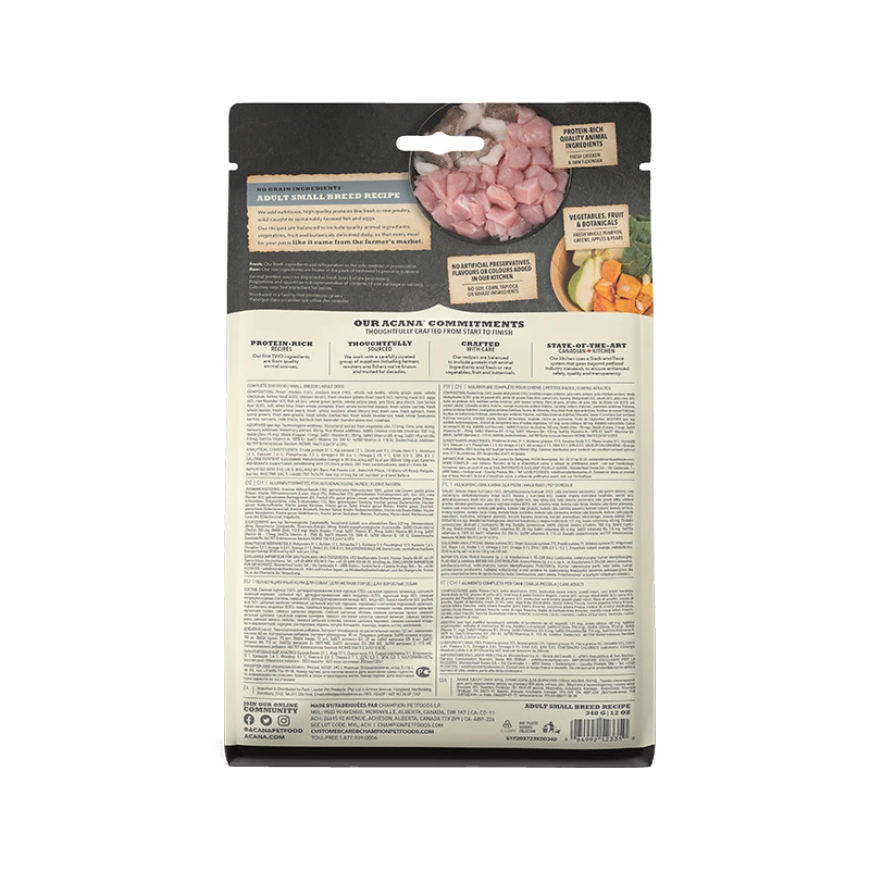 Раціон ACANA Small Breed створений відповідно до рівнів поживності, встановленими FEDIAF для собак усіх стадій життя, включаючи собак великих порід у період росту.