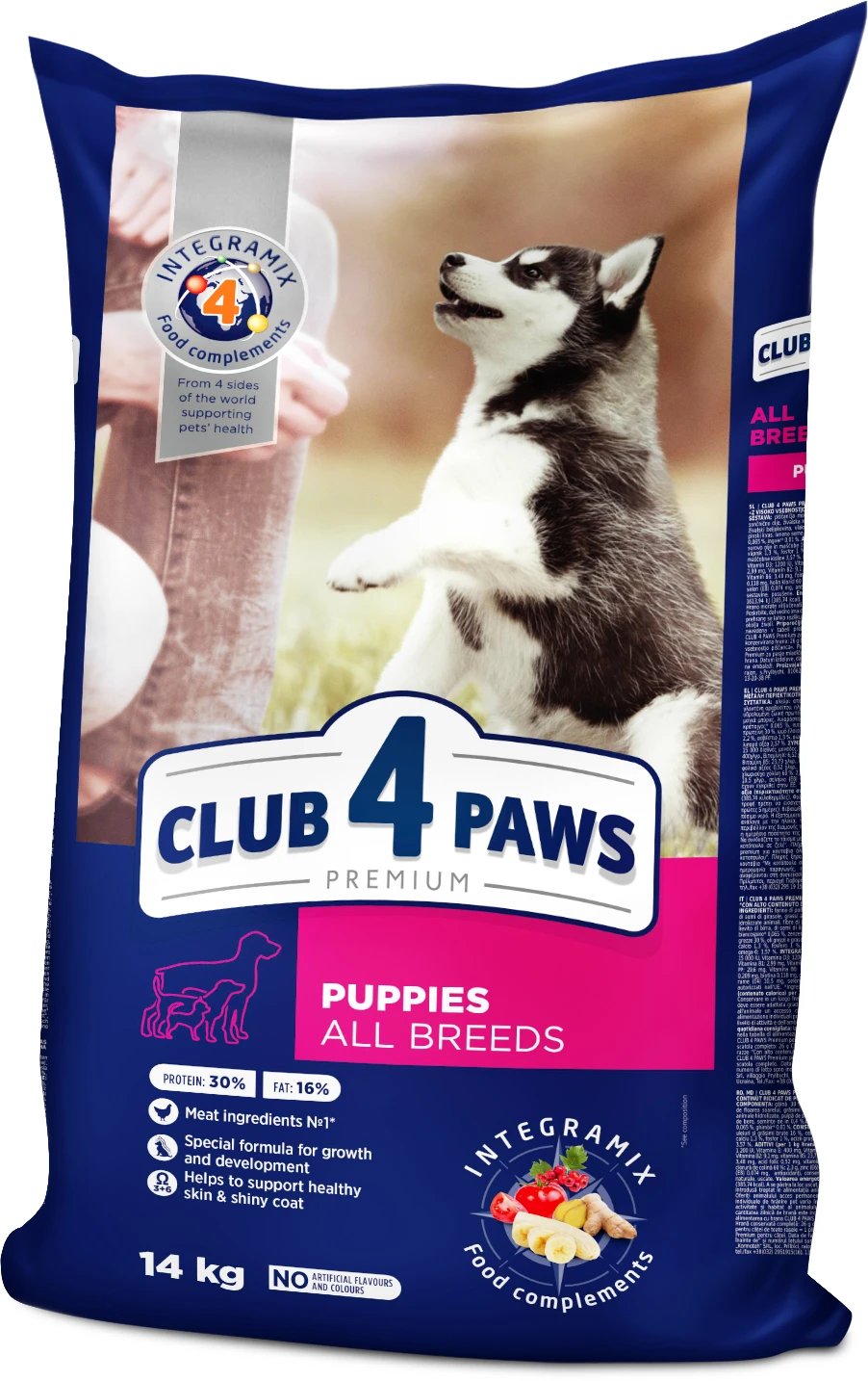 Сухий преміум-раціон Club 4 Paws для цуценят усіх порід містить м'ясні інгредієнти на 1 місці в складі, спеціальну формулу росту з високим вмістом курки (30%) для здорового розвитку в перші 12 місяців життя. Раціон збагачений комплексом Омега 3 + Омега 6 для здорової шкіри та блискучої шерсті, а також формулою INTEGRAMIX для загальної підтримки здоров'я вашого улюбленця.