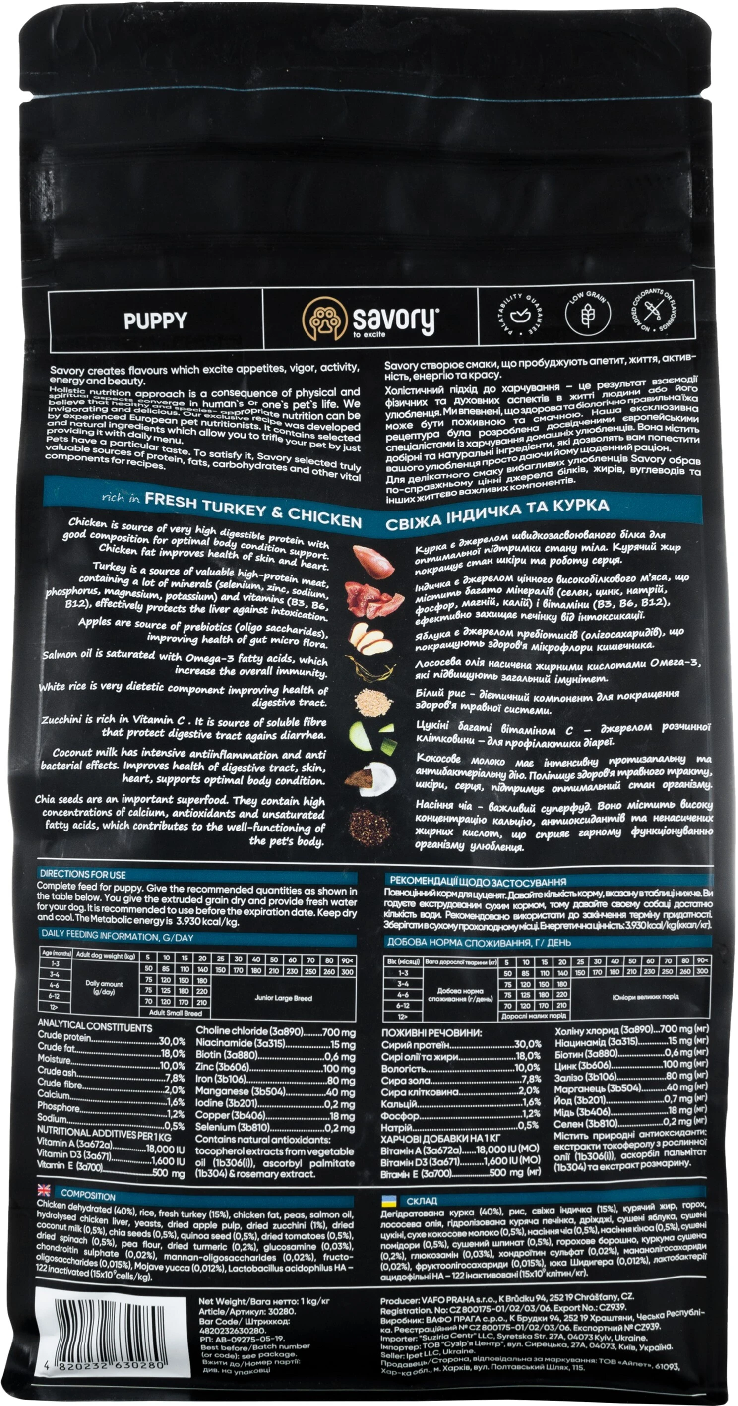 Сухий корм для цуценят Savory містить 55% якісного м'яса індички та курки, суперфуди, яблука, цукіні, шпинат. Ці компоненти створені природою для здорового росту та гармонійного розвитку малюка.