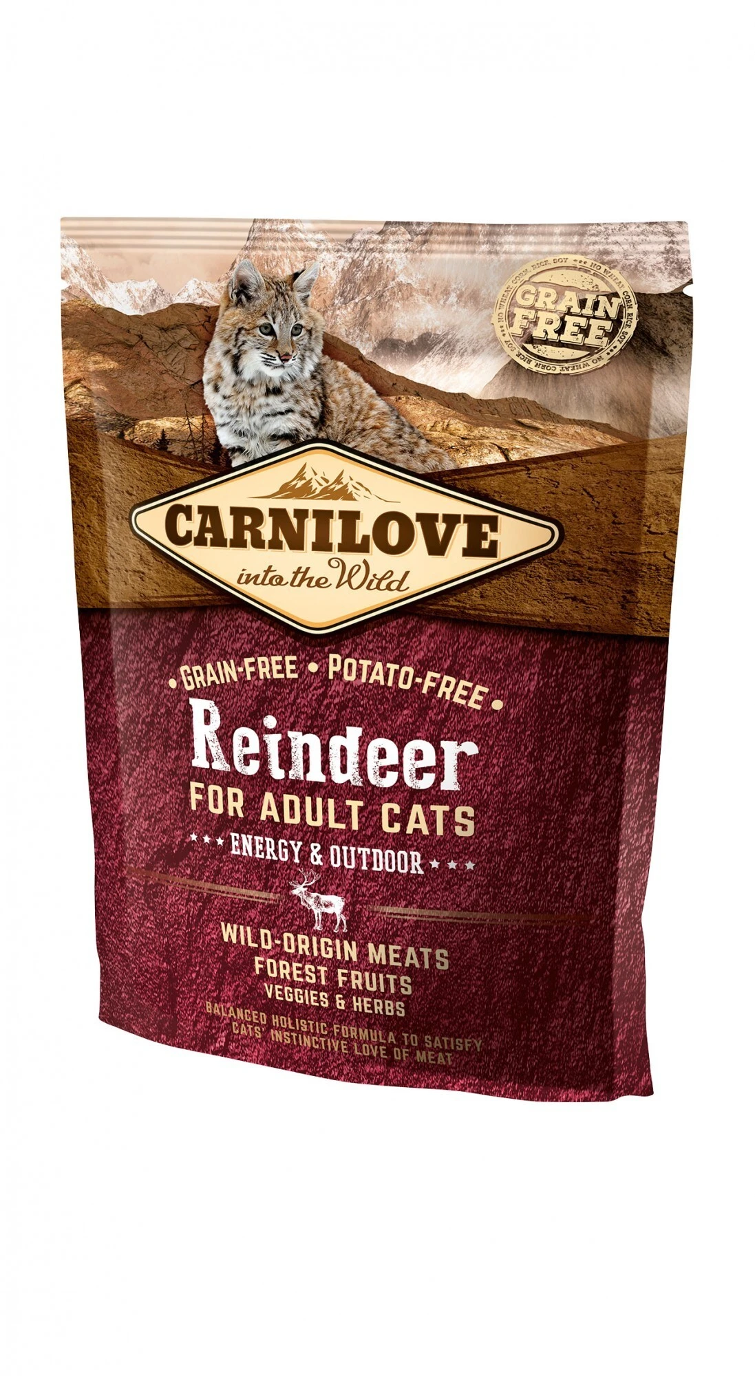 Carnilove Raindeer Energy & Outdoor — повнораціонний беззерновий сухий корм класу холістик з м'ясом північного оленя для дорослих активних котів. Склад: борошно з м'яса оленини (28%), борошно з м'яса дикого кабана (28%), жовтий горох (18%), курячий жир (консервований токоферол, 13%), куряча печінка (4%), лососеве масло (2%), тапіоковий крохмаль (2%), яблука (1%), морква (1%), насіння льону (1%), нут (1%), гідролізовані панцири ракоподібних (джерело глюкозаміну 0.026%), хрящовий екстракт (джерело хондроїтину, 0.016%), пивні дріжджі (джерело маннанолігосахаридів (0.016%), корінь цикорію (джерело фруктолігосахаридів, 0.012%), екстракт юки Шидигера (0.01%), водорості (0.01%), подорожник (0.01%), чебрець (0.01%), розмарин (0.01%), орегано (0.01%), журавлина (0.0008%), чорниця (0.0008%), малина (0.0008%). Енергетична цінність: 4050 ккал/кг. Омега-3: 0.34%, Омега-6: 2.35%. Рекомендації щодо годування: давати корм сухим або змоченим у теплій воді або бульйоні. Годувати кота необхідно три рази на день. Кількість корму може бути змінена в залежності від віку та активності вашого кота. Коли годуєте кормом Carnilove вперше, змішуйте невелику кількість з попереднім кормом і поступово збільшуйте співвідношення протягом тижня. Завжди перевіряйте наявність свіжої води.