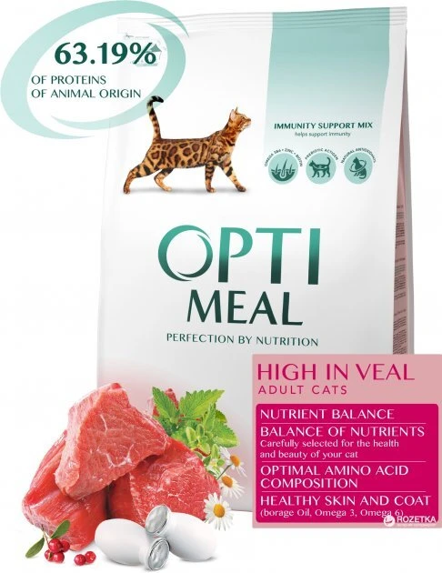 Optimeal для дорослих котів з яловичиною — суперпреміальне харчування для дорослих котів, виготовлене під контролем ветеринарів. Унікальна рецептура для здоров'я та краси домашнього улюбленця містить відбірні м'ясні інгредієнти, корисні трави, ягоди, натуральні антиоксиданти та пребіотики. Все це створює щоденний природний захист імунітету вашого кота, а також гарантує здоров'я та красу вашого улюбленця на довгі роки. Наявність у рецептурі раціону свіжого м'яса яловичини у вигляді фаршу забезпечить вашого улюбленця високоякісним легко засвоюваним протеїном тваринного походження.