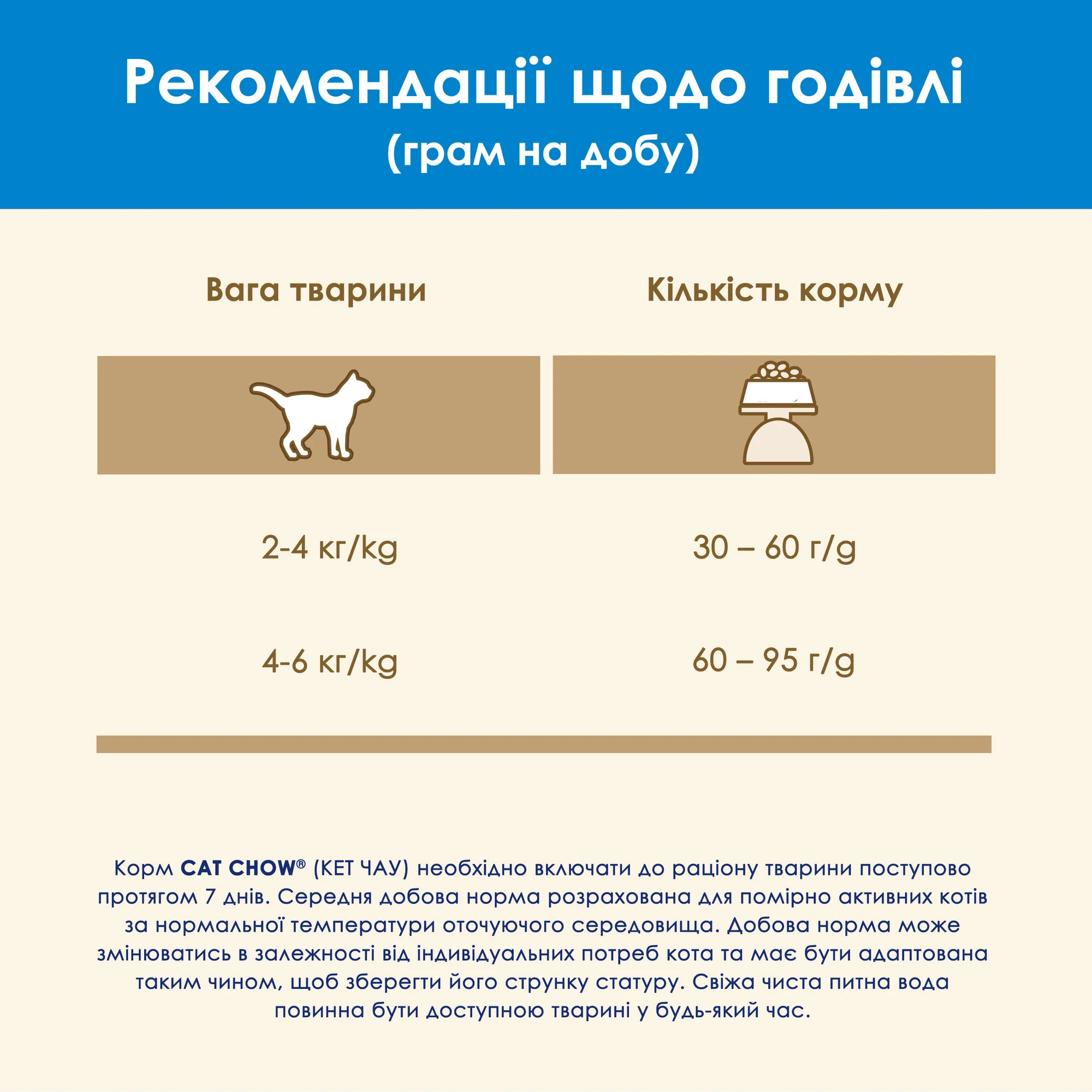 Корм для котів Cat Chow (Кет Чау) необхідно включати в раціон тварини поступово протягом 7 днів. Середня добова норма розрахована для помірно активних котів при нормальній температурі навколишнього середовища. Добова норма може варіюватися в залежності від індивідуальних потреб кота і повинна бути адаптована таким чином, щоб зберегти його струнке тіло. Свіжа чиста питна вода повинна бути доступна тварині в будь-який час.