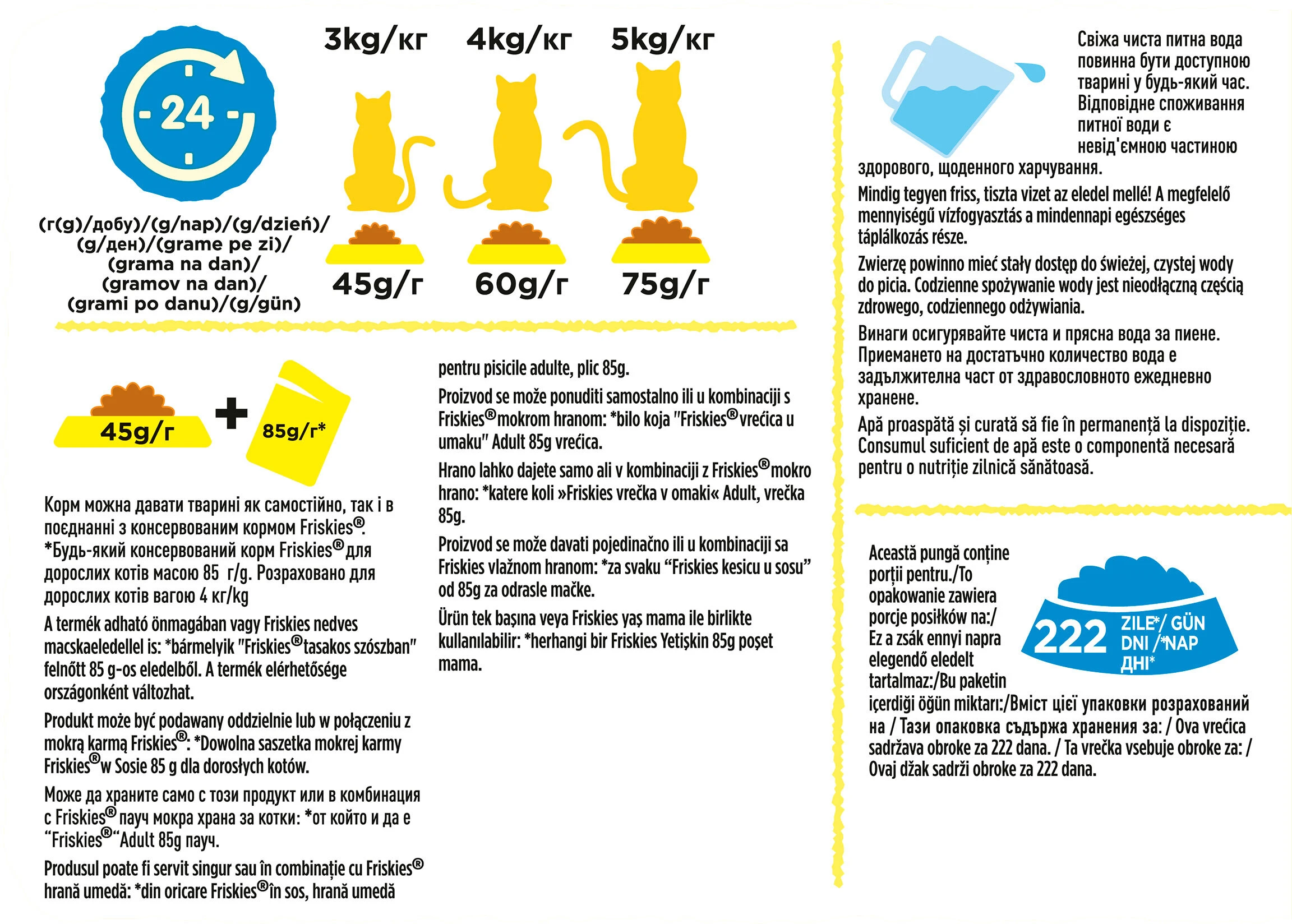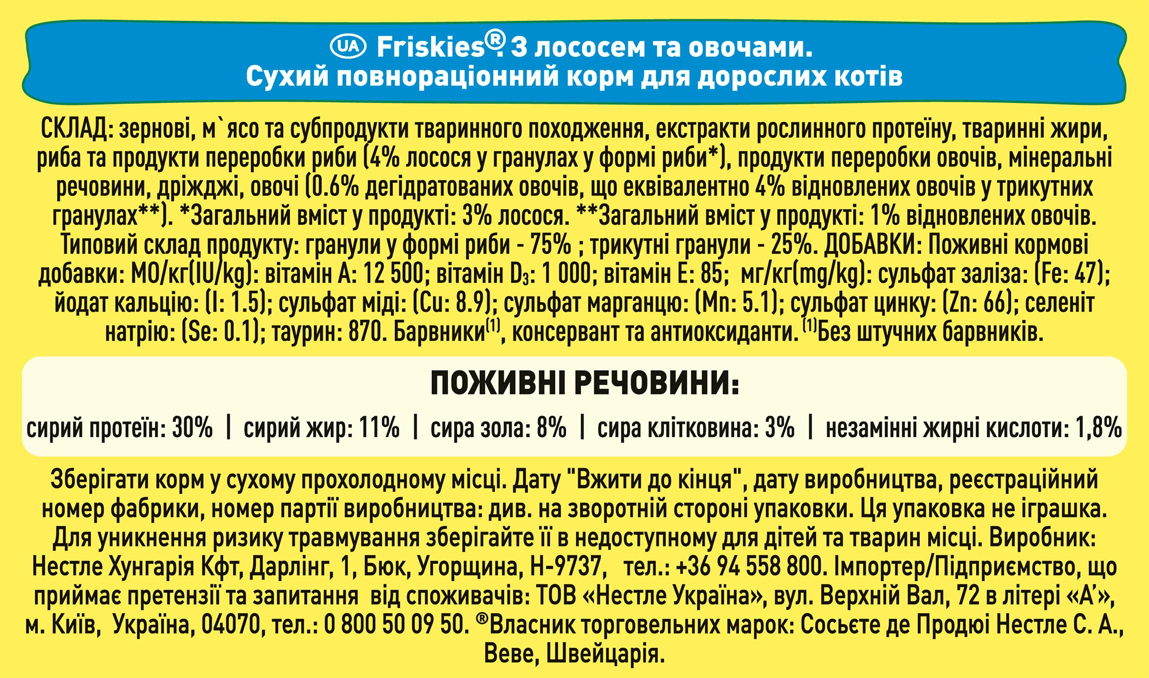 Ваш кіт унікальний, він додає вашому дому неповторності та наповнює радістю ваше життя. Friskies забезпечує його улюбленою їжею, в якій він так потребує, щоб і далі продовжувати дивувати вас і приносити радість щодня. З кожним продуктом Friskies ми зобов'язуємося надати вам асортимент смачних продуктів, які завжди будуть подобатися вашому коту. 100% повнораціонне та збалансоване харчування, що включає в себе високоякісні білки, жирні кислоти, вітаміни та мінерали для підтримки здорового, щасливого та активного життя вашого улюбленця. Корм розроблений експертами компанії Рurina з досвідом роботи в сфері харчування домашніх тварин понад 85 років. З Friskies ваш кіт робить ваш дім домом.
