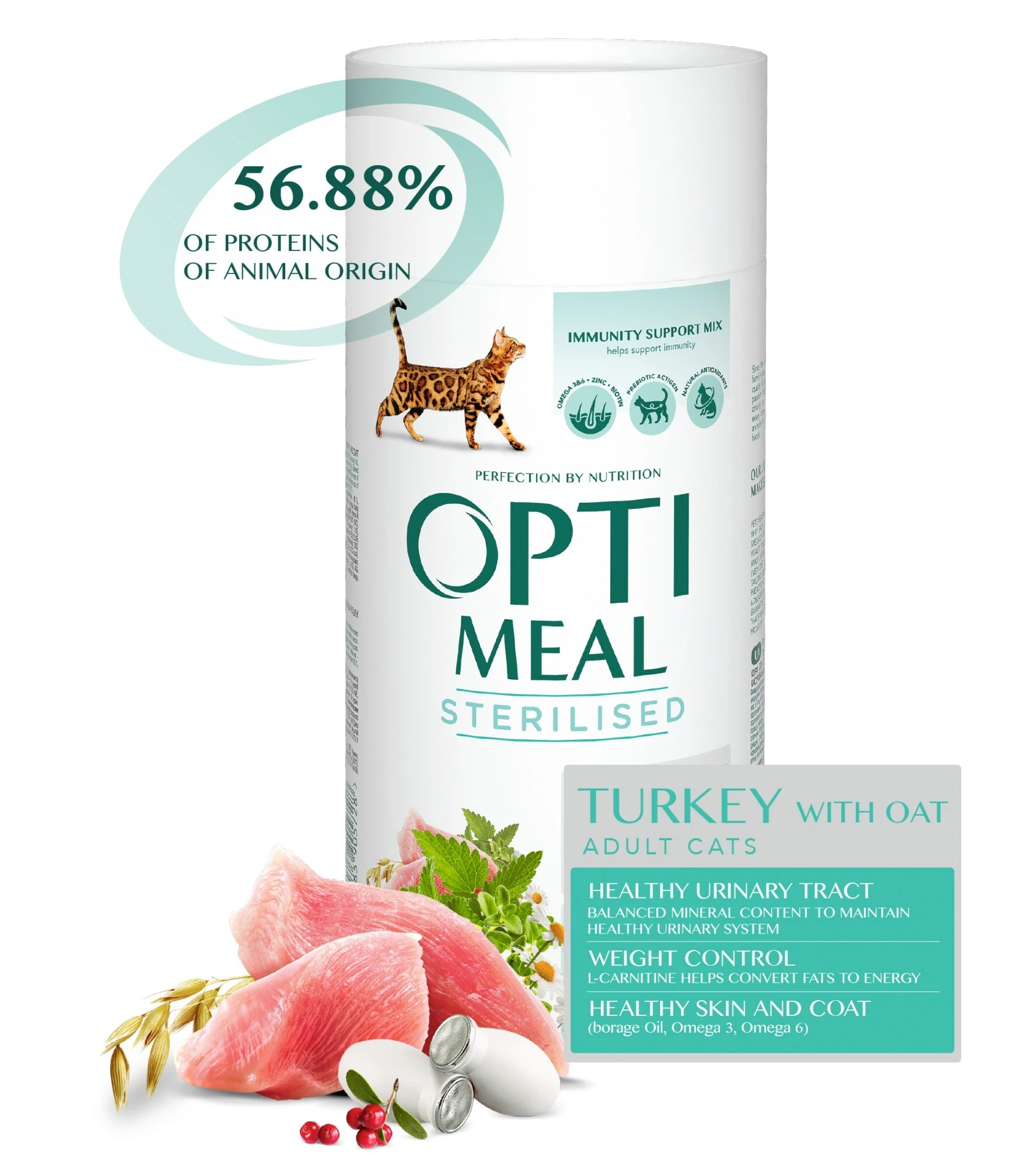 Optimeal для дорослих кастрованих котів та стерилізованих кішок з індичкою та вівсом — суперпреміальне харчування для кастрованого кота або стерилізованої кішки, виготовлене під контролем ветеринарів. Унікальна рецептура для здоров'я та краси домашнього улюбленця містить відбірні м'ясні інгредієнти, корисні трави, ягоди, натуральні антиоксиданти та пребіотики. Все це створює щоденний природний захист імунітету вашого кота, а також гарантує здоров'я та красу вашого улюбленця на довгі роки. Наявність у рецептурі раціону свіжого м'яса індички у вигляді фаршу забезпечить вашого вихованця високоякісним легкоусвояємим протеїном тваринного походження. Спеціально збалансований вміст мінеральних речовин забезпечить здоров'я сечовивідних шляхів завдяки підтримці оптимального рН сечі та утворенню сечі з низькою концентрацією кристалів. Спеціальна амінокислота L-карнітин сприятиме переробці надлишкової жирової маси в енергію, таким чином зберігаючи ідеальну форму вашого вихованця. Optimeal Повнораційний сухий корм для стерилізованих кішок та кастрованих котів — індичка та овес. Optimeal для дорослих кастрованих котів та стерилізованих кішок з індичкою та вівсом — суперпреміальне харчування для кастрованого кота або стерилізованої кішки, виготовлене під контролем ветеринарів. Унікальна рецептура для здоров'я та краси домашнього улюбленця містить відбірні м'ясні інгредієнти, корисні трави, ягоди, натуральні антиоксиданти та пребіотики. Все це створює щоденний природний захист імунітету вашого кота, а також гарантує здоров'я та красу вашого улюбленця на довгі роки. Наявність у рецептурі раціону свіжого м'яса індички у вигляді фаршу забезпечить вашого вихованця високоякісним легкоусвояємим протеїном тваринного походження. Спеціально збалансований вміст мінеральних речовин забезпечить здоров'я сечовивідних шляхів завдяки підтримці оптимального рН сечі та утворенню сечі з низькою концентрацією кристалів. Спеціальна амінокислота L-карнітин сприятиме переробці надлишкової жирової маси в енергію, таким чином зберігаючи ідеальну форму вашого вихованця. Склад: дегідратований протеїн індички, не менше 25%, кукурудзяний глютен, рис, кукурудза, голозерний овес 5.46%, жир з птиці, м'ясо індички 5%, рослинна клітковина, протеїн гідролізований тваринний 3.5%, м'якоть буряка, куряча печінка гідролізована суха, насіння льону 1.82%, пивні дріжджі, яєчний порошок, мінерали, масло лосося, журавлина 0.2%, масло огірочника, MacroGard (джерело β-глюкан) 0.05%, Actigen (джерело пребіотиків — мананоолігосахариди) 0.04%, бархатці (джерело лютеїну) 0.04%, корінь лопуха, корінь алтея, квіти ромашки 0.03%, кропива 0.03%, чебрець 0.015%. Харчова цінність 100 г корму: сирий білок - 37 г, сирі жири та олії - 12 г, сирий попіл - 6.1 г, сирі клітковини - 4.8 г, кальцій - 0.95 г, фосфор - 0.86 г, калій - 0.6 г, магній - 0.07 г. На 1 кг: омега-3 жирні кислоти - 5.1 г, омега-6 жирні кислоти - 22.1 г, 56.88% протеїнів корму — тваринного походження. Додані добавки: Харчові добавки (на 1 кг корму), мг/кг: вітамін А: 15 000 МЕ, вітамін D3: 750 МЕ, вітамін E: 600, вітамін C: 200, вітамін B6: 6, вітамін H (біотин): 0.08, L-карнітин: 100, таурин: 2 100, залізо: 35, йод: 2.5, мідь: 8.2, марганець: 38, цинк: 148, селен: 0.09, DL-метіонін: 2 700. Технологічні добавки (на 1 кг корму), мг/кг: антиоксидант природного походження: 300, екстракт токоферолів природного походження: 500. Енергетична цінність (