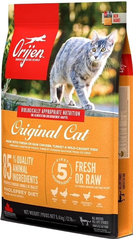Будучи м'ясоїдними від природи, сучасні коти влаштовані так само, як і їхні предки, тому, щоб бути здоровими і перебувати в найкращій кондиції, їм необхідні біологічно відповідні раціони з багатим вмістом білків і жирів з різних видів м'яса. Раціон Orijen Original Cat виготовлений з свіжих або сирих м'ясних інгредієнтів з курчат і індички, вирощених на вільному вигулі, та риби, виловленої в дикій природі.