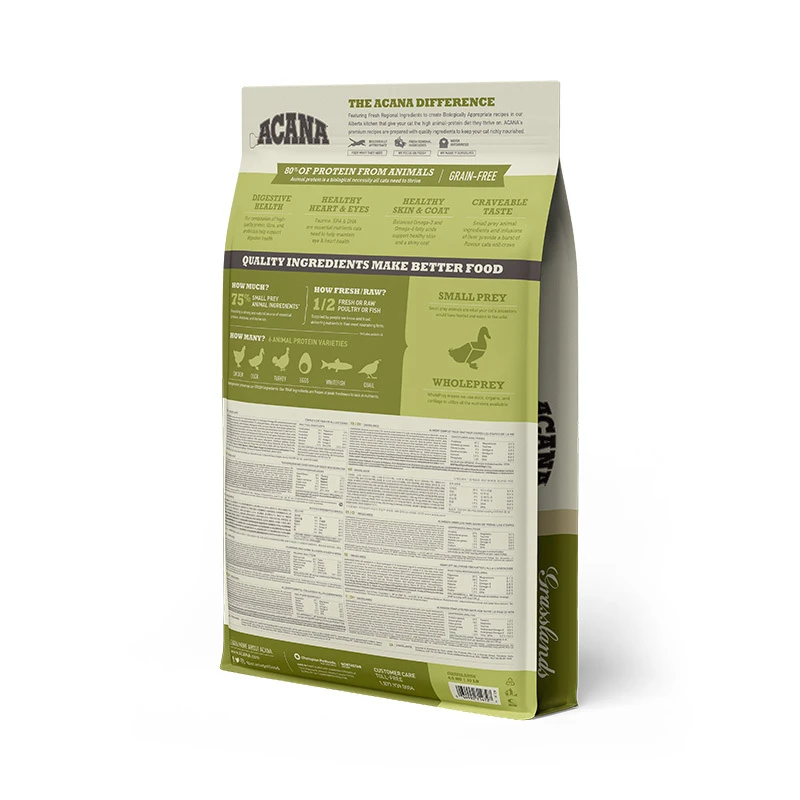 Котам необхідні раціони з багатим вмістом м'ясних протеїнів. Надихаючись нашими обширними луками та холодними північними озерами, формула ACANA Grasslands переповнена м'ясом курчат, індички та качки, вирощених на вільному вигулі, гніздовими яйцями та виловленою рибою в дикій природі. Усі інгредієнти представлені в співвідношенні WholePrey, включаючи м'ясо, органи, хрящі та їстівні кістки. Наші інгредієнти доставляються на наші кухні свіжими або сирими людьми, яких ми знаємо і яким ми довіряємо. Ми пропонуємо вашій кішці найкращі інгредієнти та рецептури, які допоможуть їм залишатися щасливими, здоровими та сильними.