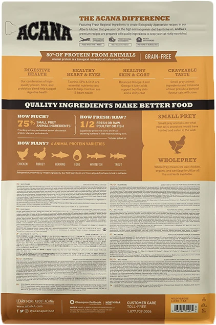 Котам необхідні раціони з багатим вмістом м'ясних протеїнів. Надихаючись нашими обширними преріями та кристальними озерами, формула ACANA Wild Prairie переповнена м'ясними інгредієнтами високої якості: м'ясом курчат і індички, вирощених на вільному вигулі, гніздовими яйцями та прісноводною рибою, виловленою в дикій природі. Усі інгредієнти представлені в співвідношенні WholePrey, включаючи м'ясо, органи, хрящі та їстівні кістки, щоб ваш улюблений вихованець отримував усе необхідне для здоров'я, відмінної фізичної форми та благополуччя.