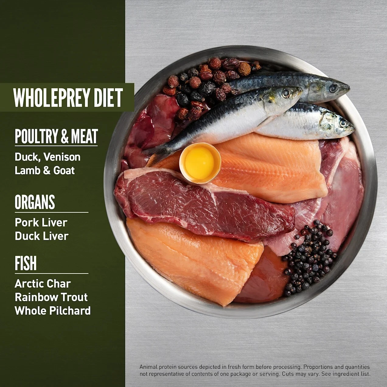 Сира качка (8%), сира арктична голець (8%), сира райдужна форель (7%), сира цільна сардина (6%), сира оленина (6%), сира свиняча печінка (5%), сира печінка качки (4%), свіжі яйця (4%), дегідратована біла риба (4%), дегідратований путасу (4%), дегідратована оселедець (4%), жир качки (4%), дегідратований ягня (4%), дегідратована баранина (4%), зелена чечевиця, нут, горох, сире ягня (3%), сире м'ясо кози (3%), сира печінка ягняти (3%), клітковина чечевиці, крохмаль гороху, цільна червона чечевиця, фасоля пестра, дегідратована качка (1%), дегідратована макрель (1%), жир минтая (1%), сирі нирки ягняти (0,5%), сира рубець ягняти (0,5%), висушена ламінарія, свіжа гарбуз, свіжа мускатна гарбуз, свіжі цукіні, свіжа морква, свіжі яблука, свіжі груші, висушений корінь цикорію, капуста кале, свіжий шпинат, свіжа зелень буряка, свіжа зелень ріпи, журавлина, чорниця, ягоди ирги, куркума, расторопша, корінь лопуха, лопух. Добавки на 1 кг: холіну хлорид (холін) 1190 мг, цинк: 105 мг, мідь 11 мг, вітамін B1 12,5 мг, вітамін B2 10 мг, вітамін B3 50 мг, вітамін B5 8 мг, вітамін B6 6,5 мг, вітамін B9 0,75 мг, вітамін B7 0,13 мг, вітамін B12 0,1 мг, вітамін K3 0,5 мг, вітамін A 3750 МЕ, вітамін D3 500 МЕ, вітамін E 170 МЕ, вітамін C 12,5 МЕ, екстракт токоферолу з рослинних олій 121 мг; лимонна кислота 40 мг. Сенсорні добавки: екстракт розмарину 80 мг. Зоотехнічні добавки: Enterococcus faecium NCIMB 10415 1x10^9 КОЕ.