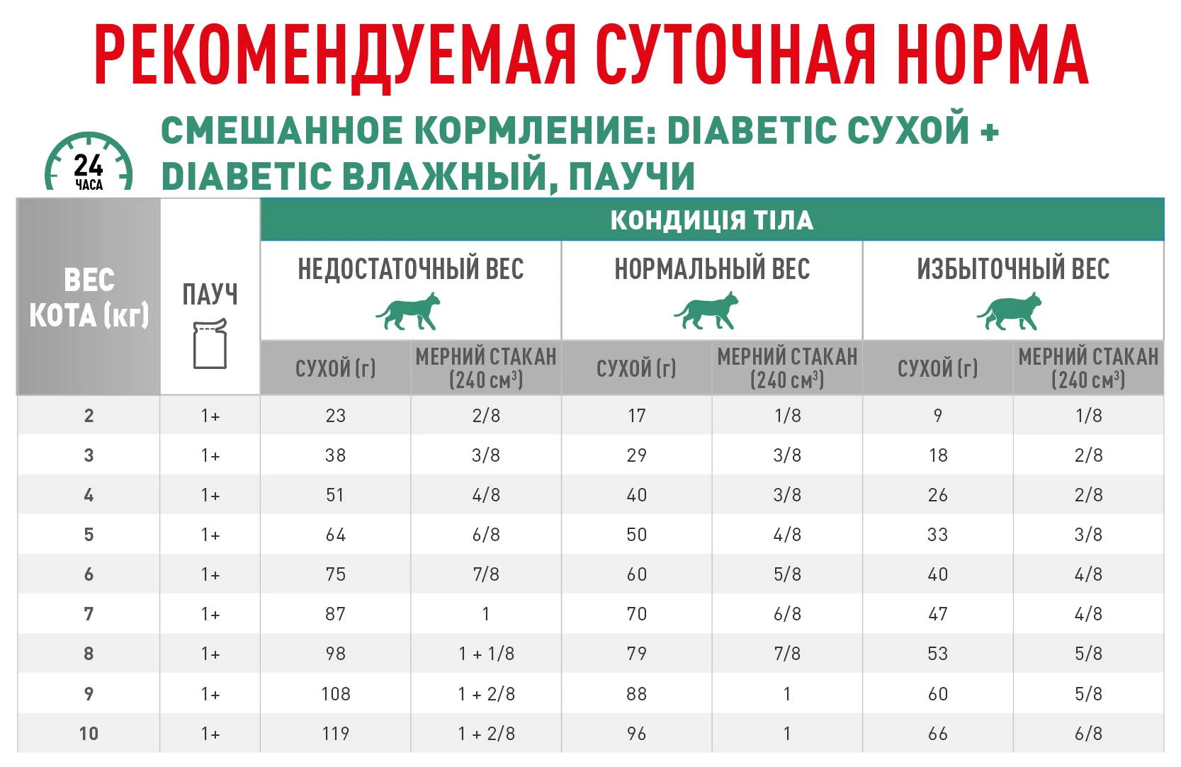 Увага! При призначенні цього корму кішки значно підвищується чутливість до інсуліну. На початку застосування дієти рекомендується контролювати рівень глікемії для уточнення дози інсуліну.