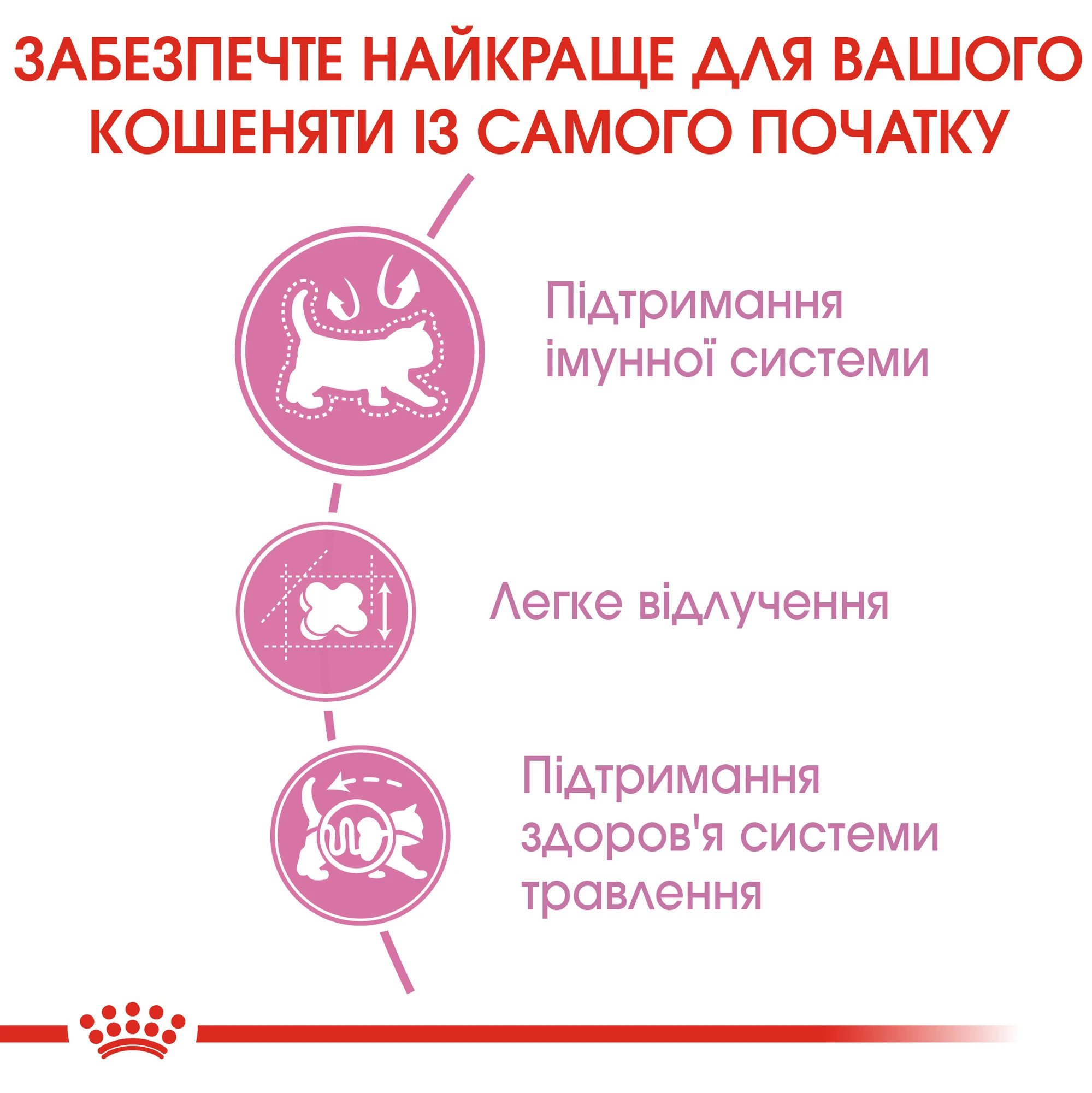 Чи годують дитину так само, як дорослу людину? Очевидно, що ні. У дітей є чутлива система травлення, маленькі щелепи, у них немає зубів, тому вони, наприклад, не можуть відкусити яблуко. Ці факти полегшують розуміння того, чому кошенятам також потрібний не такий корм, як дорослим котам. Зростання кошенят триває не менше 12 місяців, залежно від породи та статі. Гама раціонів Royal Canin Kitten має оптимальні рішення для кошенят. Виберіть найкращі вологі та сухі раціони. Маленькі крокети, легке розгризання. Компанія Royal Canin є лідером у технології розробки крокету. Розмір, форма, текстура та щільність розроблені з урахуванням специфічних особливостей кошенят.